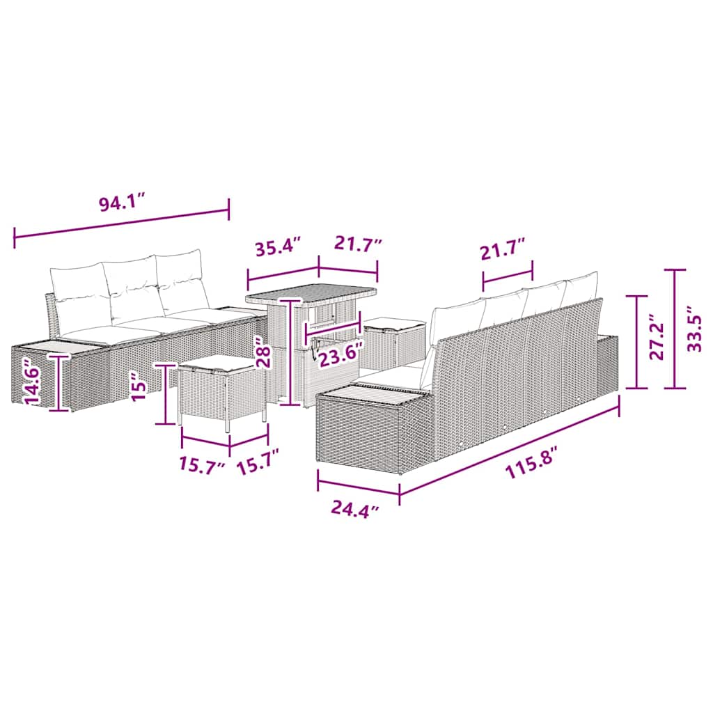 Dieses Garten Sofa Set verbindet Stil und Funktion und bietet dir einen bequemen Platz zum Entspannen im Außenbereich. Mit seinem modernen Design und den sanften Linien ist es ideal für gesellige Zeiten oder ruhige Abende draußen. ?Vielseitige Konfiguration? Das modulare Setup macht es kinderleicht, die Teile so anzuordnen, dass sie perfekt in deinen Außenbereich passen. Ideal für große Zusammenkünfte oder um einfach nur einen ruhigen Moment zu genießen. ?Bequeme Kissen? Jedes Sitzstück kommt mit plüschigen, abnehmbaren Kissen, die tollen Komfort bieten und sich super für lange Gespräche eignen. Dieses Set ist perfekt zum Chillen mit deinen Freunden und deiner Familie. ?Wetterbeständige Materialien? Hergestellt aus wetterfesten Materialien, kann das Sofa Sonne und Regen trotzen und bleibt das ganze Jahr über eine tolle Ergänzung für deinen Garten. ?Robuste Konstruktion? Der kräftige Metallrahmen in Kombi mit dem gewebten Poly Rattan sorgt dafür, dass dieses Sofa Set nicht nur stylisch, sondern auch stabil genug ist, um viele Saisons zu überstehen und dir zuverlässige Sitzgelegenheiten zu bieten. ?Reiche Ästhetik? Die trendige Mischung aus Schwarz und natürlichen Holzfarben sieht fantastisch aus in jedem Patio oder Garten und schafft eine stylische Atmosphäre für geselliges Beisammensein oder entspanntes Chillen nach einem langen Tag.
