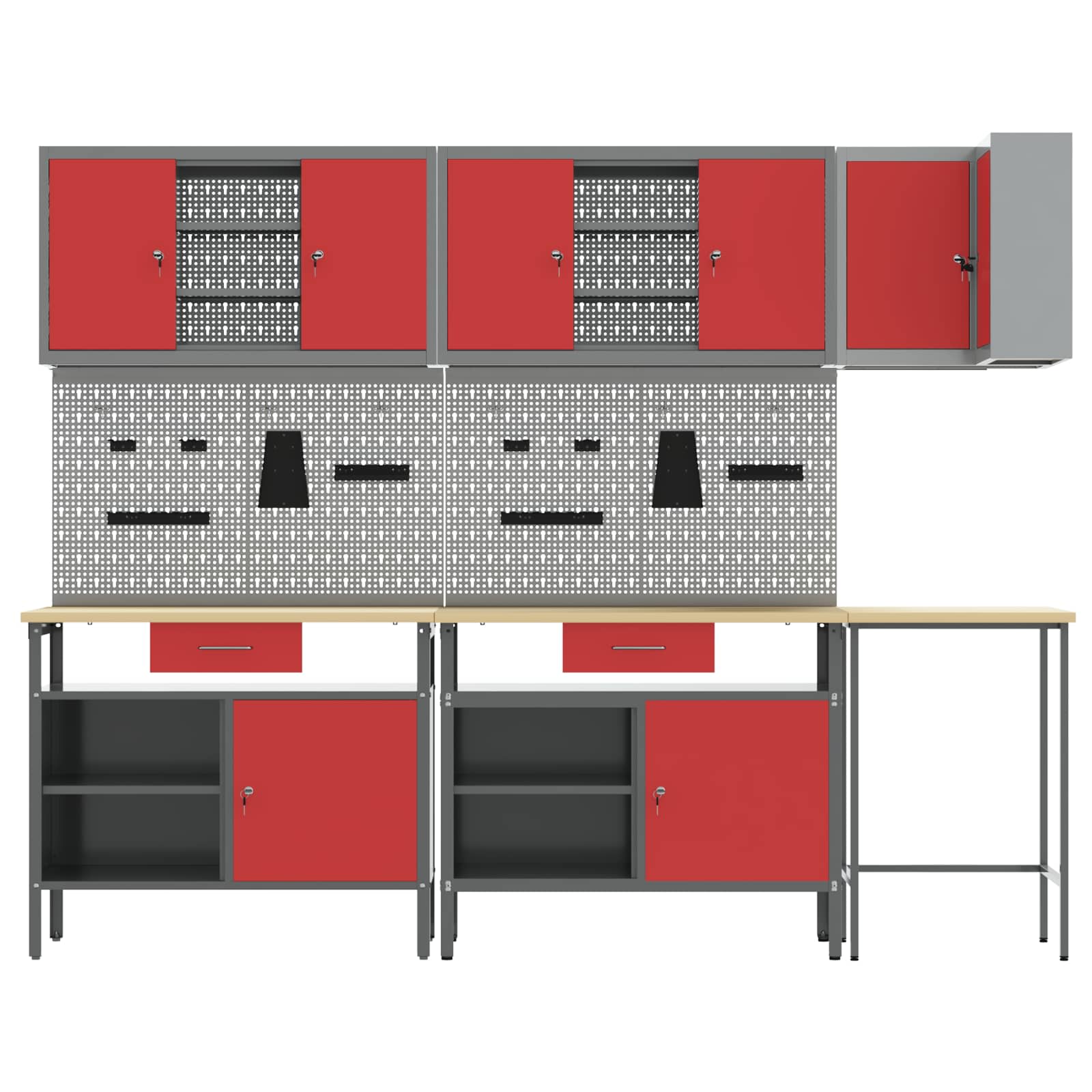 - Lieferumfang: 3x Tisch + 4x Pegboard + 3x Schrank
