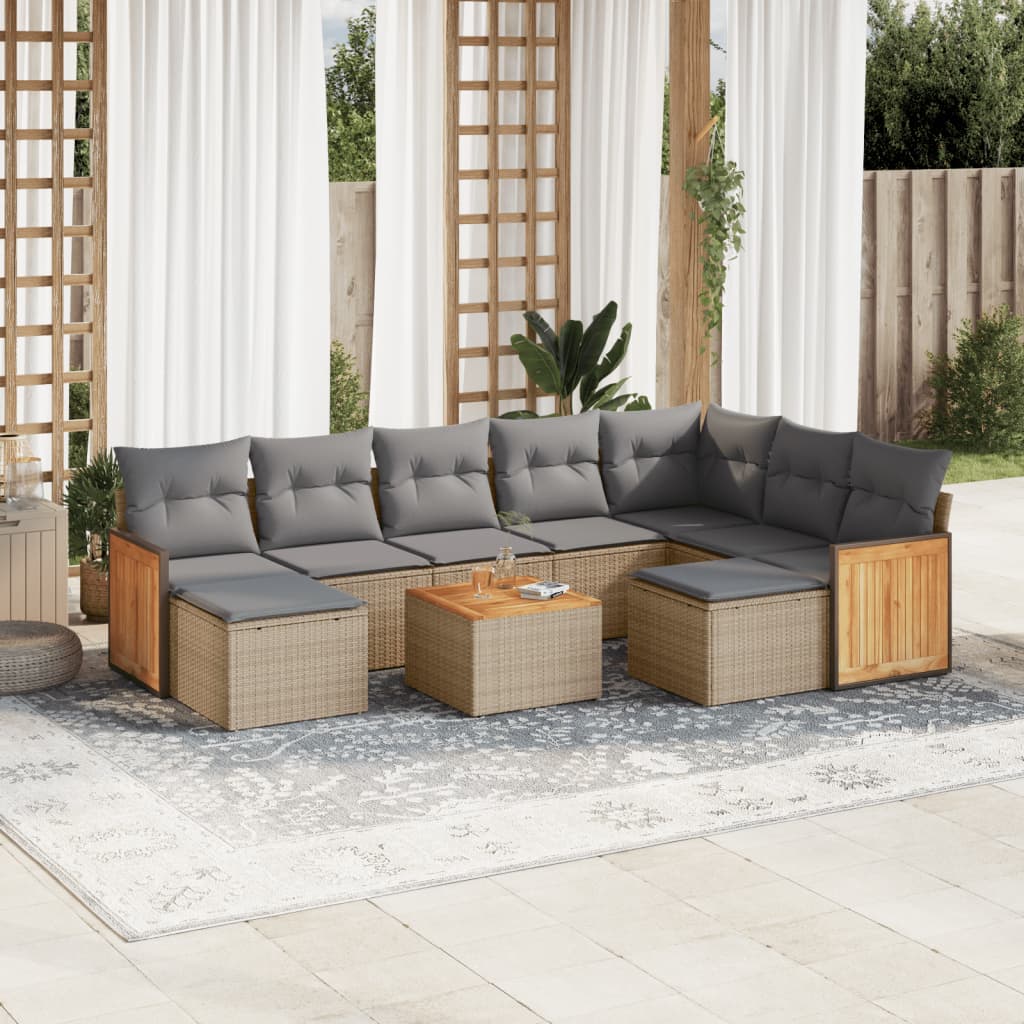 Diese Garten-Sofagarnitur ist die perfekte Ergänzung zu deinem Garten, deiner Terrasse oder deinem Innenhof. Sie bietet einen bequemen und einladenden Platz, um mit Familie und Freunden zu plaudern oder dich einfach nur zu entspannen und das Leben im Freien zu genießen. Langlebiges Material: PE-Rattan, auch als Poly Rattan bekannt, ist ein robustes, pflegeleichtes synthetisches Material, das die Optik von natürlichem Rattan aufweist. Es kennzeichnet sich durch ein geringes Eigengewicht und lässt sich einfach reinigen. Aufgrund seiner Haltbarkeit und Witterungsbeständigkeit wird es häufig bei der Herstellung von Gartenmöbeln verwendet.Bequemes Sitzerlebnis: Dieser Gartensessel mit dick gepolsterten Kissen bietet ein angenehmes Sitzgefühl.Stabile und pflegeleichte Tischplatte: Dieser Gartentisch besitzt eine Tischplatte aus Akazienholz, die robust und langlebig ist und sich leicht mit einem feuchten Tuch reinigen lässt.Abnehmbarer und waschbarer Bezug: Diese Sitzkissen verfügen über abnehmbare Bezüge für einfaches Waschen und Pflegen.Modulares Design: Dank des modularen Designs lassen sich die Gartenmöbel völlig flexibel und einfach umstellen, um deinen Außenbereich ganz individuell zu gestalten. Gut zu wissen:Wir empfehlen dir, deine Gartenmöbel mit einer wasserdichten Hülle zu schützen, um lange Zeit eine ansprechende Optik aufzuweisen.