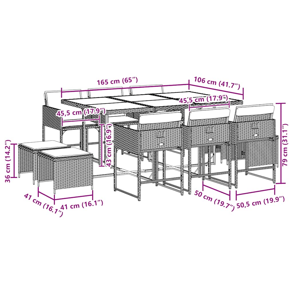 Diese Garten-Essgruppe ist eine ideale Wahl für Mahlzeiten im Freien oder einfach nur zum Entspannen im Garten, Hinterhof oder auf der Terrasse. Langlebiges Material: PE-Rattan, auch als Poly Rattan bekannt, ist ein robustes, pflegeleichtes synthetisches Material, das die Optik von natürlichem Rattan aufweist. Es kennzeichnet sich durch ein geringes Eigengewicht und lässt sich einfach reinigen. Aufgrund seiner Haltbarkeit und Witterungsbeständigkeit wird es häufig bei der Herstellung von Gartenmöbeln verwendet.Platzsparende Aufbewahrung: Dank der klappbaren Rückenlehne lassen sich die Stühle unter dem Tisch verstauen. Zudem finden auch die Hocker Platz unter den Stühlen, sodass die gesamte Essgruppe bei Nichtgebrauch eine platzsparende Würfelform bildet, um deinen verfügbaren Platz optimal auszunutzen.Bequemes Sitzerlebnis: Dieser Gartensessel mit dick gepolsterten Kissen bietet ein angenehmes Sitzgefühl.Abnehmbarer und waschbarer Bezug: Die Sitzkissen verfügen über abnehmbare Bezüge, die sich ganz einfach waschen und reinigen lassen. Dank der Klappen an der Rückseite können die Kissen ganz einfach an den Rückenlehnen befestigt werden.Stabile und pflegeleichte Tischplatte: Dieser Gartentisch besitzt eine Tischplatte aus Akazienholz, die robust und langlebig ist und sich leicht mit einem feuchten Tuch reinigen lässt. Gut zu wissen: Wir empfehlen dir, deine Gartenmöbel mit einer wasserdichten Hülle zu schützen, um lange Zeit eine ansprechende Optik aufzuweisen.