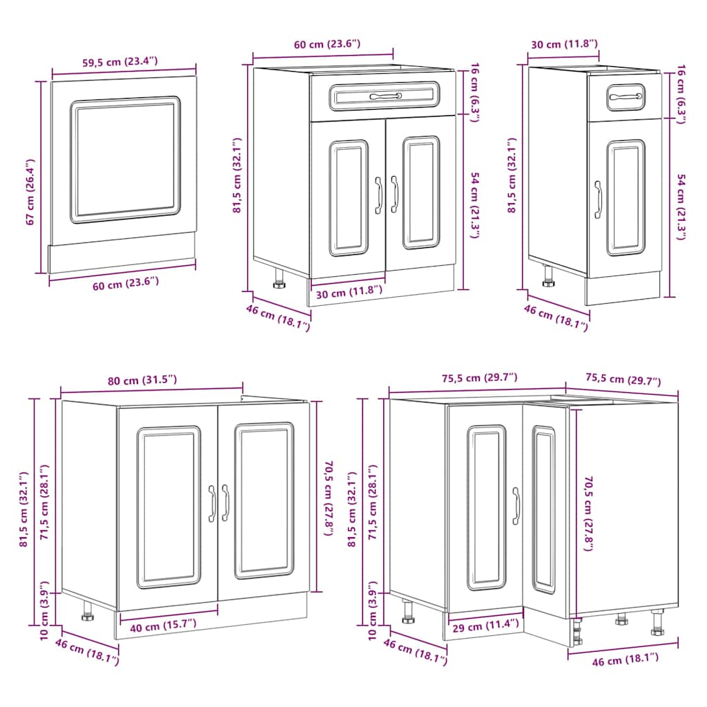 Mit ihrem eleganten Design optimiert diese 11-teilige Küchenzeile Ihre Küche und bietet reichlich Stauraum für Ihre Küchenausstattung! Starkes und langlebiges Material: Holzwerkstoff ist ein langlebiges und robustes Material mit einer glatten Oberfläche, das gegen Feuchtigkeit, Verformung und Rissbildung beständig ist, wodurch es eine zuverlässigen Wahl für die Herstellung von Möbeln ist.Viel Stauraum: Das Küchenschrank-Set hat viele Fächer und bietet ausreichend Platz für Schüsseln, Teller, Töpfe und andere Küchengeräte.Verstellbare Füße: Die Unterschränke sind mit verstellbaren Füßen ausgestattet, die sich in der Höhe an deine Kücheneinrichtung anpassen lassen.Pflegeleicht: Dank der glatten Oberfläche lassen sich diese Küchenschränke leicht mit einem feuchten Tuch reinigen und benötigen weniger Pflege. Achtung:Um ein Umkippen zu vermeiden, sollte dieses Produkt mit der mitgelieferten Wandhalterung gesichert werden. Gut zu wissen:Schrauben und Dübel für die Wandbefestigung sind nicht enthalten. Suchen und verwenden Sie die für Ihre Wände geeigneten Schrauben und Dübel. Wenn Sie unsicher sind, suchen Sie professionelle Hilfe. Lesen und befolgen Sie jeden Schritt der Anleitung sorgfältig.Die Arbeitsplatte, das Spülbecken und der Wasserhahn sind nicht im Lieferumfang enthalten.