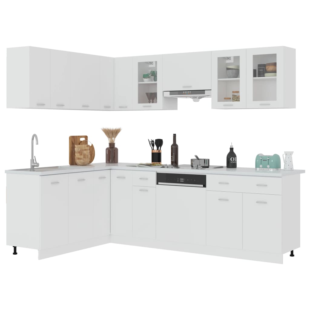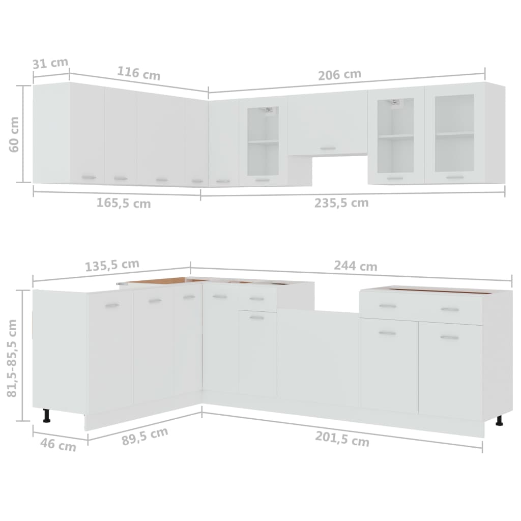Mit ihrem eleganten Design optimiert diese 11-teilige Küchenzeile Ihre Küche und bietet reichlich Stauraum für Ihre Küchenausstattung! Diese Schränke sind langlebig und funktional und sorgen für eine bessere Organisation Ihrer Küche. Sie bieten außerdem ausreichend Platz für Geschirr, Besteck und Küchengeräte. Die Geschirrspülerblende verfügt über ein schlichtes Design und bietet einen ästhetischen Schutz für die Spülmaschine. Zusätzlich ist diese Küchenzeile leicht mit einem feuchten Tuch zu reinigen. Bitte beachten Sie: Die Arbeitsplatte, der Wasserhahn, das Spülbecken und die Elektrogeräte sind nicht im Lieferumfang enthalten.