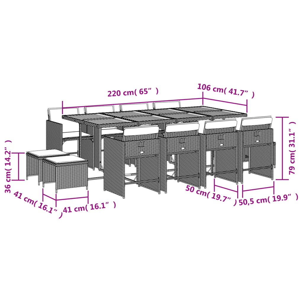 Diese Garten-Essgruppe ist eine ideale Wahl für Mahlzeiten im Freien oder einfach nur zum Entspannen im Garten, Hinterhof oder auf der Terrasse. Langlebiges Material: PE-Rattan, auch als Poly Rattan bekannt, ist ein robustes, pflegeleichtes synthetisches Material, das die Optik von natürlichem Rattan aufweist. Es kennzeichnet sich durch ein geringes Eigengewicht und lässt sich einfach reinigen. Aufgrund seiner Haltbarkeit und Witterungsbeständigkeit wird es häufig bei der Herstellung von Gartenmöbeln verwendet.Platzsparende Aufbewahrung: Dank der klappbaren Rückenlehne lassen sich die Stühle unter dem Tisch verstauen. Zudem finden auch die Hocker Platz unter den Stühlen, sodass die gesamte Essgruppe bei Nichtgebrauch eine platzsparende Würfelform bildet, um deinen verfügbaren Platz optimal auszunutzen.Bequemes Sitzerlebnis: Dieser Gartensessel mit dick gepolsterten Kissen bietet ein angenehmes Sitzgefühl.Abnehmbarer und waschbarer Bezug: Die Sitzkissen verfügen über abnehmbare Bezüge, die sich ganz einfach waschen und reinigen lassen. Dank der Klappen an der Rückseite können die Sitzkissen ganz einfach an den Stühlen befestigt werden.Stabile und pflegeleichte Tischplatte: Dieser Gartentisch besitzt eine Tischplatte aus Akazienholz, die robust und langlebig ist und sich leicht mit einem feuchten Tuch reinigen lässt. Gut zu wissen: Wir empfehlen dir, deine Gartenmöbel mit einer wasserdichten Hülle zu schützen, um lange Zeit eine ansprechende Optik aufzuweisen.