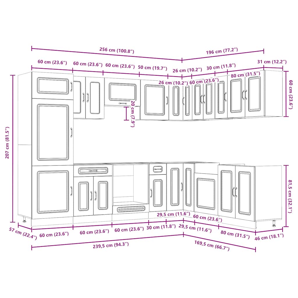 Mit ihrem eleganten Design optimiert diese 14-teilige Küchenzeile Ihre Küche und bietet reichlich Platz für Ihre Küchenausstattung! Starkes und langlebiges Material: Holzwerkstoff ist ein langlebiges und robustes Material mit einer glatten Oberfläche, das gegen Feuchtigkeit, Verformung und Rissbildung beständig ist, wodurch es eine zuverlässigen Wahl für die Herstellung von Möbeln ist.Viel Stauraum: Das Küchenschrank-Set hat viele Fächer und bietet ausreichend Platz für Schüsseln, Teller, Töpfe und andere Küchengeräte.Verstellbare Füße: Die Unterschränke sind mit verstellbaren Füßen ausgestattet, die sich in der Höhe an deine Kücheneinrichtung anpassen lassen.Pflegeleicht: Dank der glatten Oberfläche lassen sich diese Küchenschränke leicht mit einem feuchten Tuch reinigen und benötigen weniger Pflege. Achtung:Um ein Umkippen zu vermeiden, sollte dieses Produkt mit der mitgelieferten Wandhalterung gesichert werden. Gut zu wissen:Schrauben und Dübel für die Wandbefestigung sind nicht enthalten. Suchen und verwenden Sie die für Ihre Wände geeigneten Schrauben und Dübel. Wenn Sie unsicher sind, suchen Sie professionelle Hilfe. Lesen und befolgen Sie jeden Schritt der Anleitung sorgfältig.Die Arbeitsplatte, das Spülbecken und der Wasserhahn sind nicht im Lieferumfang enthalten.
