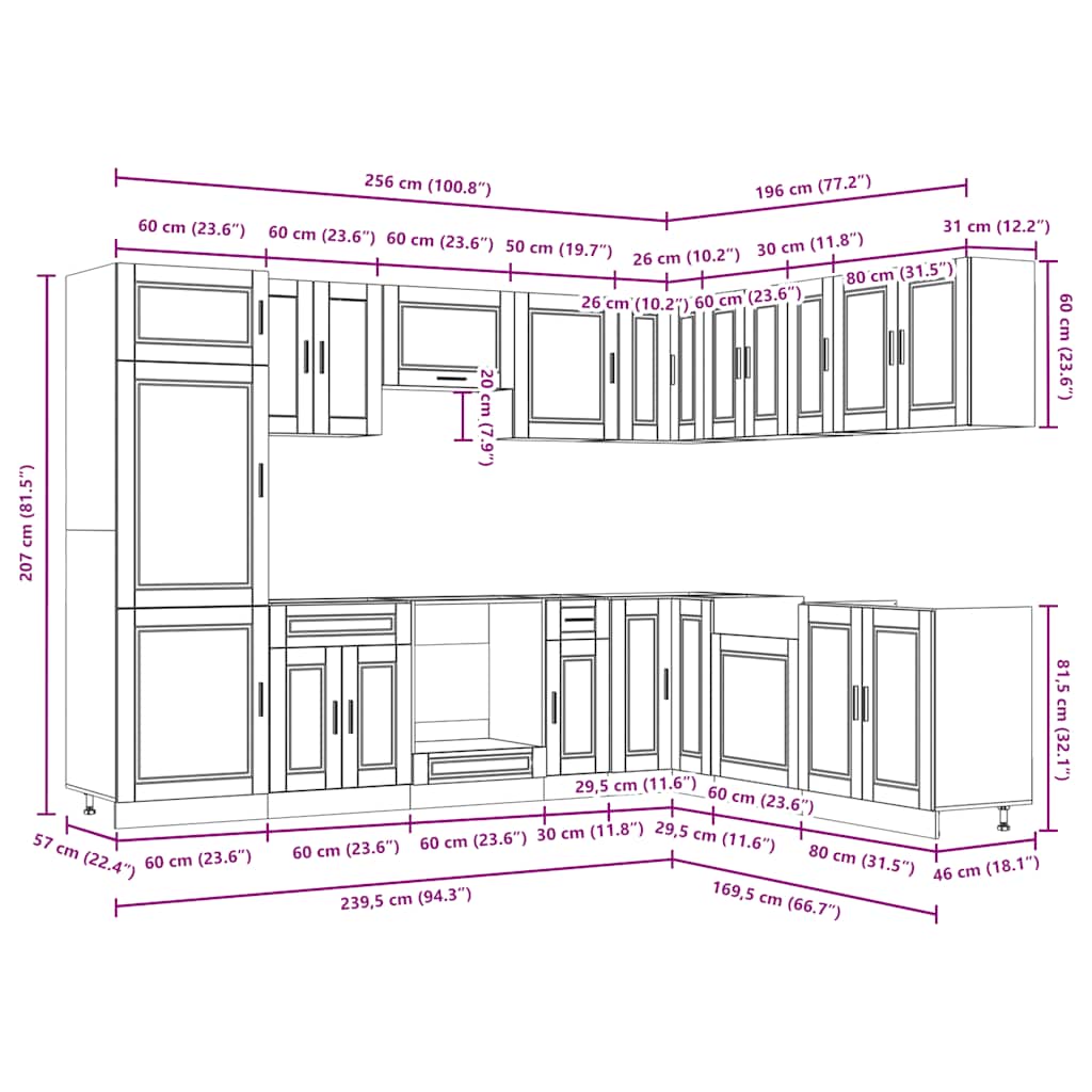 - 1 x Küchenschrank: 60 x 57 x 207 cm (B x T x H)