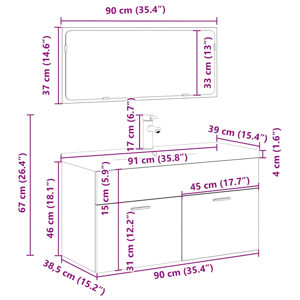 Dieses stilvolle Badmöbel-Set mit viel Stauraum ist eine ausgezeichnete Ergänzung für Ihr Badezimmer, denn es verleiht ihm ein aufgeräumtes und auffälliges Erscheinungsbild! Robustes Material: Der Unterschrank besteht aus Holzwerkstoff, einem Material von außergewöhnlicher Qualität mit glatter Oberfläche, das sich durch Festigkeit, Stabilität und Feuchtigkeitsbeständigkeit auszeichnet.Reichlich Stauraum: Das Waschbecken im Badezimmer bietet ausreichend Stauraum, um Gegenstände in Ihrem Badezimmer zu verstauen.Praktisches Design: Auf der Oberseite dieses Badschranks findet dein Waschbecken den idealen Platz.Wandmontage: Der Badezimmerschrank lässt sich an der Wand montieren, um zusätzlichen Stauraum zu schaffen. Auf diese Weise kannst du deine Stellfläche maximieren und leichter für Ordnung sorgen.Überlauffunktion: Ein Überlauf sorgt dafür, dass das Wasser abfließt, wenn das Waschbecken zu voll wird. Gut zu wissen:Schrauben und Dübel für die Wandbefestigung sind nicht enthalten. Suchen und verwenden Sie die für Ihre Wände geeigneten Schrauben und Dübel. Wenn Sie unsicher sind, suchen Sie professionelle Hilfe. Lesen und befolgen Sie jeden Schritt der Anleitung sorgfältig.Wasserhahn und Ablauf mit Überlauffunktion sind im Lieferumfang enthalten.Es handelt sich um eine Warm- und Kaltwasser-Armatur. Für Warmwasser ist der Anschluss eines Warmwasserbereiters erforderlich.