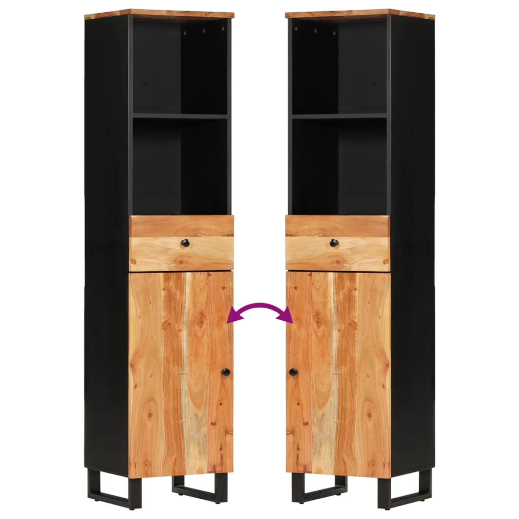 Dieses praktische Badmöbel-Set mit geräumigem Stauraum ist eine hervorragende Ergänzung für dein Badezimmer und verleiht ihm ein aufgeräumtes und eindrucksvolles Aussehen! Akazien-Massivholz: Der Schrank ist aus massivem Akazienholz in Kombination mit Holzwerkstoff gefertigt. Massives Akazienholz ist ein schönes Naturmaterial. Es ist ein tropisches Hartholz, das dicht, robust und langlebig ist.Ausreichend Stauraum: Der Badezimmerschrank bietet verschiedene Aufbewahrungsmöglichkeiten und geräumigen Platz für die Aufbewahrung von Gegenständen in deinem Badezimmer.Stabile Beine: Die Eisenbeine verleihen dem Badezimmerschrank Robustheit und Stabilität.Praktisches Design: Die Oberseite des Waschbeckenunterschranks ist ideal für die Unterbringung des Waschbeckens.Klares Spiegelbild: Der Glasspiegel bietet eine klare Spiegelung. So kannst du ein schönes und natürliches Spiegelbild genießen, wenn du vor dem Spiegel steht. Achtung:Um ein Umkippen zu vermeiden, sollte dieses Produkt mit der mitgelieferten Wandhalterung gesichert werden.Gut zu wissen:Das Waschbecken ist nicht im Lieferumfang enthalten.Schrauben und Dübel sind für die Befestigung an der Wand nicht im Lieferumfang enthalten. Wir empfehlen, speziell für deine Wände geeignete Schrauben und Dübel zu finden und zu verwenden. Im Zweifelsfall wende dich an einen Fachmann. Bitte lese und befolge jeden Schritt der Anweisungen.Jedes Stück ist ein Unikat, das in Farbe und Maserung variiert. Die Lieferung erfolgt in zufälliger Reihenfolge, wodurch die Exklusivität und Individualität deines Produkts gewährleistet wird.