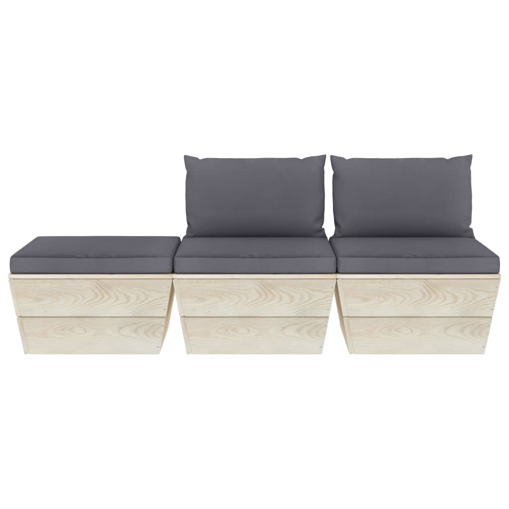 Diese 3-teilige Garten-Sofagarnitur aus Paletten mit Kissen ist eine ausgezeichnete Wahl, um sich zu entspannen und das Wetter zu genießen, ein Nickerchen zu machen oder mit Ihrer Familie oder Freunden zu plaudern. Mit seinem zeitlosen Palettendesign verleiht dieses Lounge-Set aus Holz Ihrer Terrasse, Ihrem Garten oder Ihrem Wohnzimmer einen Hauch von rustikalem Charme. Das Garten-Lounge-Set besteht aus imprägniertem Fichtenholz und ist somit langlebig und stabil. Diese Terrassen-Sofagarnitur verfügt über eine solide Konstruktion und ist wartungsarm. Dank der Bezüge aus 100 % Polyester und der dicken Polsterung fühlen sich die Palettenauflagen weich an und bieten höchsten Komfort. Darüber hinaus ermöglicht Ihnen der modulare Aufbau, das Set in einer beliebigen Anordnung je nach Ihrem Geschmack aufzustellen. Bitte beachten Sie, dass Holz ein Naturprodukt ist und daher Unvollkommenheiten aufweisen kann.