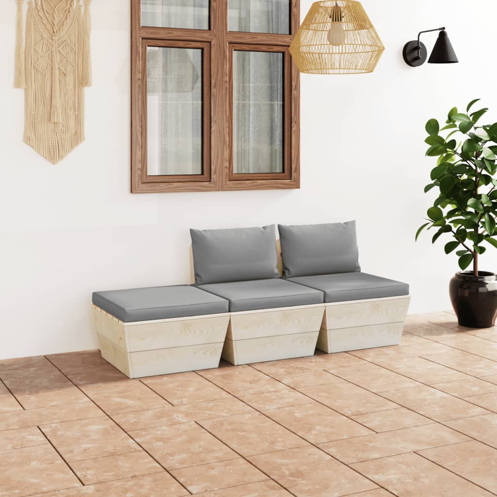 Diese 3-teilige Garten-Sofagarnitur aus Paletten mit Kissen ist eine ausgezeichnete Wahl, um sich zu entspannen und das Wetter zu genießen, ein Nickerchen zu machen oder mit Ihrer Familie oder Freunden zu plaudern. Mit seinem zeitlosen Palettendesign verleiht dieses Lounge-Set aus Holz Ihrer Terrasse, Ihrem Garten oder Ihrem Wohnzimmer einen Hauch von rustikalem Charme. Das Garten-Lounge-Set besteht aus imprägniertem Fichtenholz und ist somit langlebig und stabil. Diese Terrassen-Sofagarnitur verfügt über eine solide Konstruktion und ist wartungsarm. Dank der Bezüge aus 100 % Polyester und der dicken Polsterung fühlen sich die Palettenauflagen weich an und bieten höchsten Komfort. Darüber hinaus ermöglicht Ihnen der modulare Aufbau, das Set in einer beliebigen Anordnung je nach Ihrem Geschmack aufzustellen. Bitte beachten Sie, dass Holz ein Naturprodukt ist und daher Unvollkommenheiten aufweisen kann.