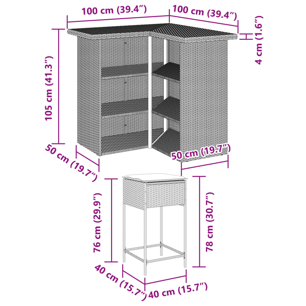 Dieses trendige Gartenbar-Set vereint Stil und Funktionalität und wird ein echter Hingucker in deinem Garten, auf deiner Terrasse oder in jedem anderen Außenbereich sein. Langlebiges Material: PE-Rattan, auch als Poly Rattan bekannt, ist ein robustes, pflegeleichtes synthetisches Material, das die Optik von natürlichem Rattan aufweist. Es kennzeichnet sich durch ein geringes Eigengewicht und lässt sich einfach reinigen. Aufgrund seiner Haltbarkeit und Witterungsbeständigkeit wird es häufig bei der Herstellung von Gartenmöbeln verwendet.Bequemes Sitzerlebnis: Dieser Gartensessel mit dick gepolsterten Kissen bietet ein angenehmes Sitzgefühl.Abnehmbarer und waschbarer Bezug: Diese Sitzkissen verfügen über abnehmbare Bezüge für einfaches Waschen und Pflegen.Robuster und stabiler Rahmen: Dank des pulverbeschichteten Stahlrahmens ist das Möbelstück robust, stabil und für den täglichen Einsatz im Außenbereich geeignet. Gut zu wissen:Wir empfehlen dir, deine Gartenmöbel mit einer wasserdichten Hülle zu schützen, um lange Zeit eine ansprechende Optik aufzuweisen.