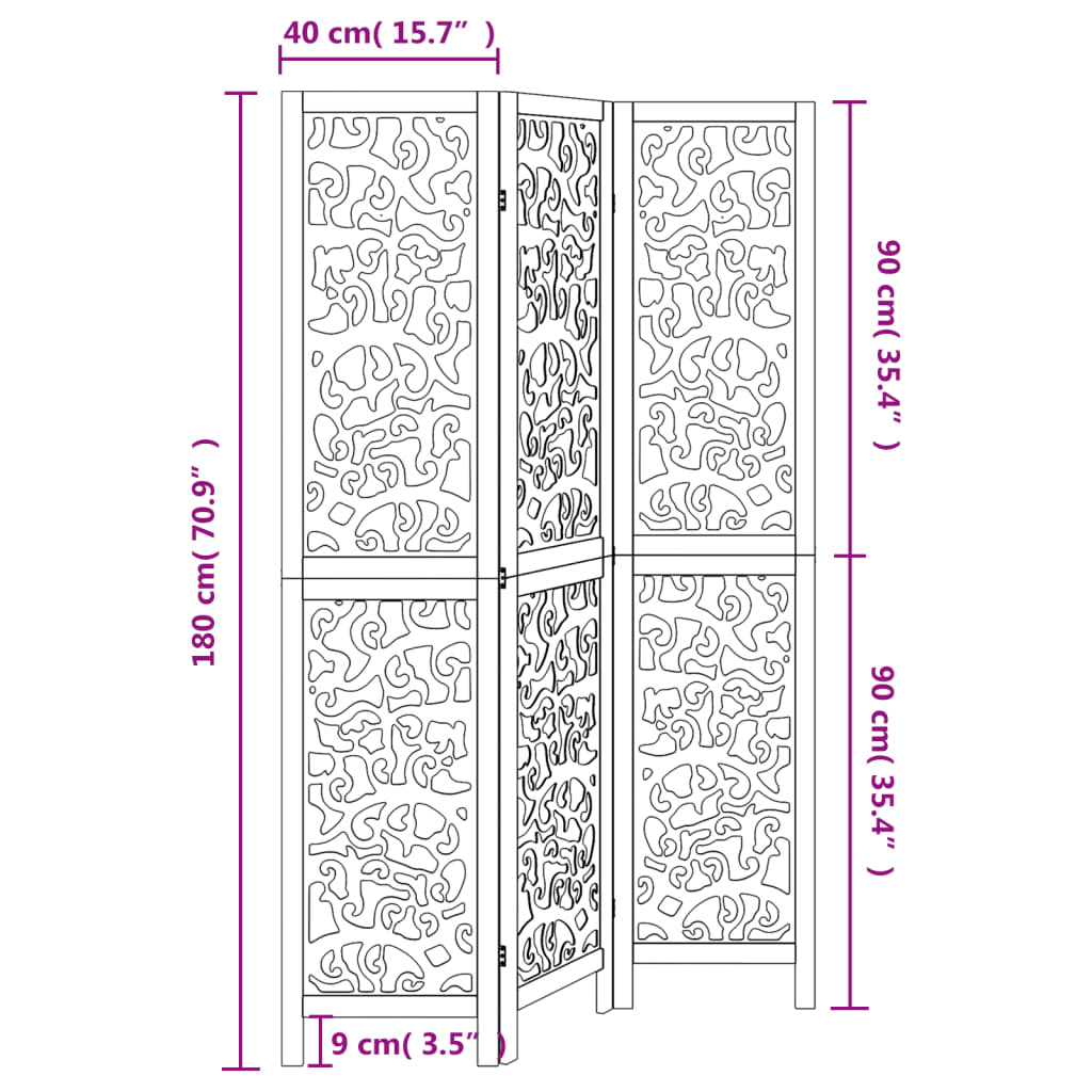 Verleihe deinem Wohnraum eine auffällige dekorative Note mit diesem bezaubernden Raumteiler. Langlebig und leicht zu reinigen: Der Sichtschutz ist aus Paulownia-Massivholz und Holzwerkstoff gefertigt, wodurch er pflegeleicht und strapazierfähig ist.Robuster Rahmen: Der Rahmen aus massivem Paulownia-Holz sorgt für Robustheit und Stabilität. Paulownia-Massivholz ist ein wunderschönes Naturmaterial. Paulowniaholz ist widerstandsfähig gegen Schädlingsbefall und Verrottung.Flexibel und einfach faltbar: Die Paravent-Teile sind jeweils durch 3 Metallscharniere miteinander verbunden. Die oberen und unteren Paneele dieser spanischen Wand sind durch verborgene 2-in-1-Scharniere verbunden. Der Raumtrenner kann also leicht bis zu einem gewissen Grad zusammengeklappt werden; dadurch spart er bei Nichtgebrauch Platz.Vielseitig einsetzbar: Die Trennwand eignet sich hervorragend zur Schaffung von Privatsphäre im Schlafzimmer, Wohnzimmer, Büro und anderen Räumen. Du kannst das Paravent auch vor ein Fenster stellen, um intensives Sonnenlicht abzuschirmen.Attraktiver Look: Mit seinem filigranen Muster verleiht diese faltbare Trennwand jedem Raum mehr Charakter. Achtung:Nur für den Innenbereich!