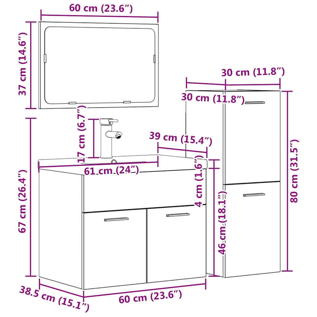 Dieses praktische Badmöbel-Set mit geräumigem Stauraum ist eine hervorragende Ergänzung für dein Badezimmer und verleiht ihm ein aufgeräumtes und eindrucksvolles Aussehen! Starkes und langlebiges Material: Holzwerkstoff ist ein langlebiges und robustes Material mit einer glatten Oberfläche, das gegen Feuchtigkeit, Verformung und Rissbildung beständig ist, wodurch es eine zuverlässigen Wahl für die Herstellung von Möbeln ist.Langlebiges Material: Das aus Keramik gefertigte Waschbecken besitzt eine robuste Oberfläche, die Stößen, Flecken und Kratzern widersteht und einen lang anhaltenden Glanz aufweist.Reichlich Stauraum: Der Badezimmerschrank bietet reichlich Platz, um wichtigste Toilettenartikel und Badutensilien wie Seife, Shampoo, Zahnpasta usw. zu verstauen.Platzsparendes Design: Dieser Badezimmerschrank lässt sich an der Wand montieren, um zusätzlichen Stauraum zu schaffen. Auf diese Weise kannst du deine Bodenfläche maximieren und für Ordnung im Raum sorgen.Klares Spiegelbild: Die Spiegelfläche aus Glas bietet eine feine und unverzerrte Spiegelung, sodass sie sich zum Schminken, Rasieren oder Gesichtspflege eignet.Pflegeleicht: Dank seiner glatten Oberfläche lässt sich der Badschrank mit einem feuchten Tuch leicht reinigen und erfordert wenig Pflege. Gut zu wissen:Schrauben und Dübel für die Montage an der Wand sind nicht enthalten. Passendes Montagezubehör muss separat gekauft werden. Wenn du dir bezüglich der Montage nicht sicher bist, wende dich bitte an einen Fachmann. Bitte lies und befolge jeden Schritt in der Anleitung.