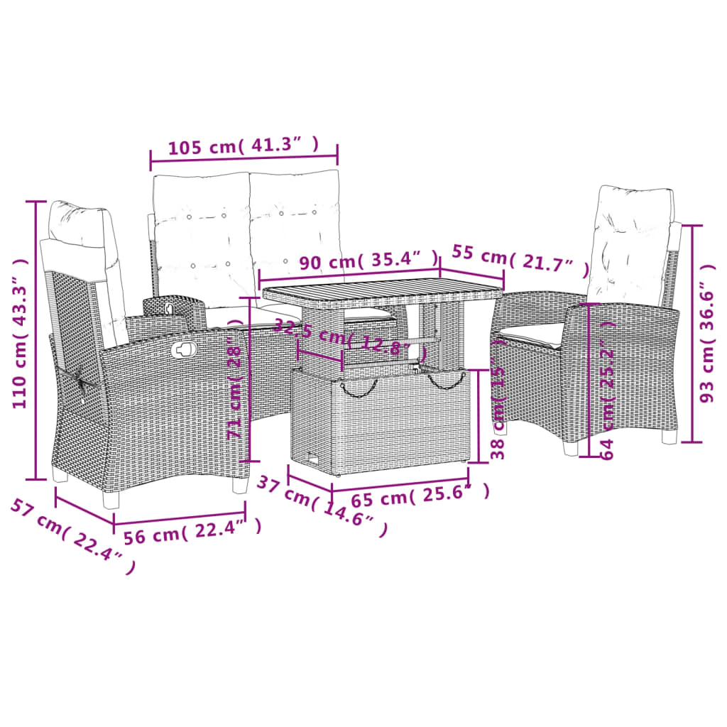 Diese Garten-Essgruppe ist eine ideale Wahl für Mahlzeiten im Freien oder einfach nur zum Entspannen im Garten, Hinterhof oder auf der Terrasse. Langlebiges Material: PE-Rattan, auch als Poly Rattan bekannt, ist ein robustes, pflegeleichtes synthetisches Material, das die Optik von natürlichem Rattan aufweist. Es kennzeichnet sich durch ein geringes Eigengewicht und lässt sich einfach reinigen. Aufgrund seiner Haltbarkeit und Witterungsbeständigkeit wird es häufig bei der Herstellung von Gartenmöbeln verwendet.Verstellbare Rückenlehne: Der Gartensessel ist mit einem Griff versehen. So kannst du die Rückenlehne durch Ziehen des Griffs verstellen und sie danach schnell wieder in ihre ursprüngliche Position bringen.Verstellbare Tischplatte: Die Tischplatte lässt sich anheben, um den Gartentisch höher zu machen und ihn von einem Couchtisch in einen Esstisch zu verwandeln. Er eignet sich daher perfekt für Gäste oder Mahlzeiten im Freien.Abnehmbarer und waschbarer Bezug: Die Sitzkissen verfügen über abnehmbare Bezüge, die sich ganz einfach waschen und reinigen lassen. Dank der Klappen an der Rückseite können die Rückenkissen ganz einfach an den Rückenlehnen befestigt werden.Bequemes Sitzerlebnis: Dieser Gartensessel mit dick gepolsterten Kissen bietet ein angenehmes Sitzgefühl. Gut zu wissen:Wir empfehlen dir, deine Gartenmöbel mit einer wasserdichten Hülle zu schützen, um lange Zeit eine ansprechende Optik aufzuweisen.