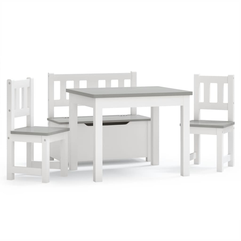Mit diesem Tisch und Stuhl-Set kann Ihr Kind mit Freunden am Tisch sitzen und malen, basteln, essen oder zusammen spielen. Dieses Set aus Tisch und Stühlen besteht aus langlebigem MDF und ist daher leicht zu reinigen und zu pflegen. Neben dem routinemäßigen Lesen und Schreiben kann der Tisch auch für Puzzles, Brettspiele, Basteln und zum Genießen von Snacks verwendet werden. Die Kinderbank stellt eine perfekte Kombination aus Sitzgelegenheit und Stauraum dar. Dabei bietet die integrierte Truhe mit Deckel den idealen Platz zur ordentlichen Aufbewahrung von Spielzeugen und anderen Sachen. Die Kanten und Ecken des Tisches und der Stühle sind abgerundet, um die Sicherheit der Kinder zu gewährleisten. Das Kindermöbel-Set bietet den Kleinen ein perfektes eigenes Plätzchen und lässt sich in den eigenen vier Wänden aber auch Schulen, Kindergärten usw. einsetzen.