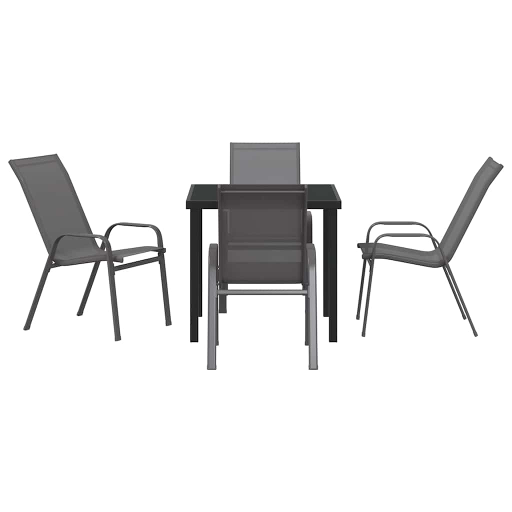 Das 5-teilige Garten Essset dreht sich alles um entspanntes Essen draußen, kombiniert Stil mit Praktikabilität. Das coole graue Stahl-Aussehen in Verbindung mit Textilene verleiht deinem Patio einen besonderen Charme und bietet gleichzeitig bequeme Sitzmöglichkeiten für Mahlzeiten oder Entspannung. Robuste Stahlkonstruktion: Dieses Set hat einen stabilen Stahlrahmen, der wetterbeständig ist und einen tollen Essbereich draußen schafft. Geräumige Sitzkapazität: Mit Platz für vier ist es perfekt für Familienfeiern oder kleine Partys, wodurch Mahlzeiten im Freien gemütlich werden. Elegantes mattes Finish: Das glatte Finish gibt einen eleganten Touch und vermeidet Blendeffekte, sodass dein Garten oder Patio toll aussieht. Bequem und praktisch: Die Stühle haben flache Armlehnen und bequeme Textilene, ideal für längere Mahlzeiten und pflegeleicht für draußen. Perfekt für verschiedene Umgebungen: Super für Balkone oder Patios, verwandelt dieses Essset deinen Außenbereich in einen einladenden Ort, an dem Familie und Freunde gemeinsam Essen genießen können.