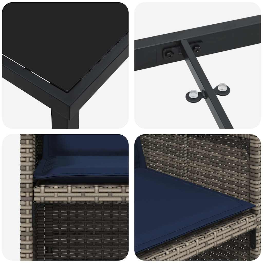 Dieses Garten-Essset bringt Stil und Praktikabilität zusammen und ist ideal für gesellige Stunden im Freien. Mit dem grauen Poly-Rattan-Design und den marineblauen Kissen bietet es nicht nur Farbe für deine Terrasse oder deinen Balkon, sondern ist auch ein bequemer Ort zum Essen oder Entspannen mit Freunden und Familie. Stylisches Design: Das schicke graue Poly-Rattan macht das Set super ansprechend und passt in verschiedene Umgebungen. Bequeme Sitzgelegenheiten: Jeder Stuhl hat dicke, gepolsterte Kissen aus robustem Stoff und sorgt für einen entspannten Sitz, egal ob beim Essen oder Relaxen. Haltbarkeit: Hergestellt aus PE-Rattan und pulverbeschichtetem Stahl, hält dieses Set unterschiedlichen Wetterbedingungen stand und bleibt das ganze Jahr über funktional. Kompakte Aufbewahrung: Die faltbare Rückenlehne von jedem Stuhl macht es einfach, ihn wegzusparen, wenn er gebraucht wird, und sorgt für Ordnung im Außenbereich. Wartungsfreundlich: Die abnehmbaren Kissenbezüge erleichtern die Reinigung und sorgen dafür, dass dein Gartentisch-Set immer frisch aussieht.