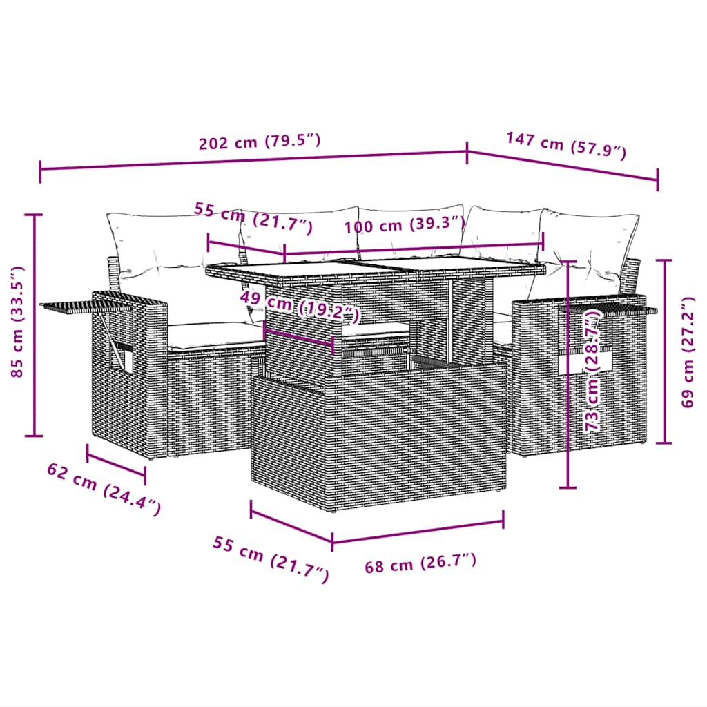 Dieses Gartensofa-Set ist die perfekte Ergänzung für Ihren Garten, Ihre Terrasse oder Ihren Innenhof und bietet einen komfortablen und einladenden Platz zum Plaudern mit Familie und Freunden oder einfach zum Entspannen und Genießen der Natur. Langlebiges Material: PE-Rattan, auch bekannt als Polyrattan, ist ein robustes, pflegeleichtes Kunststoffmaterial, das wie natürliches Rattan aussieht. Es ist leicht, einfach zu reinigen und wird aufgrund seiner Langlebigkeit und Wetterbeständigkeit häufig für Gartenmöbel verwendet.Verstellbare Tischplatte: Die Tischplatte kann angehoben werden, um den Tisch höher zu stellen, wodurch der Gartentisch von einem Couchtisch in einen Esstisch verwandelt wird. Er ist perfekt, um Gäste zu empfangen oder Mahlzeiten im Freien einzunehmen.Praktischer Beistelltisch: Dieses Gartenmöbel verfügt über klappbare Beistelltische mit Gasdruckfeder an den Armlehnen, die praktische Ablageflächen für wichtige Dinge bieten. Bequemes Sitzerlebnis: Diese Gartenmöbel mit dick gepolsterten Kissen bieten ein bequemes Sitzerlebnis.Modulares Design: Dieses Gartenmöbel-Set ist modular aufgebaut und daher völlig flexibel und leicht zu bewegen, sodass Sie Ihre Gartenmöbel individuell zusammenstellen können. Gut zu wissen:Damit Ihre Gartenmöbel lange schön bleiben, empfehlen wir Ihnen, sie mit einer wasserdichten Abdeckung zu schützen.