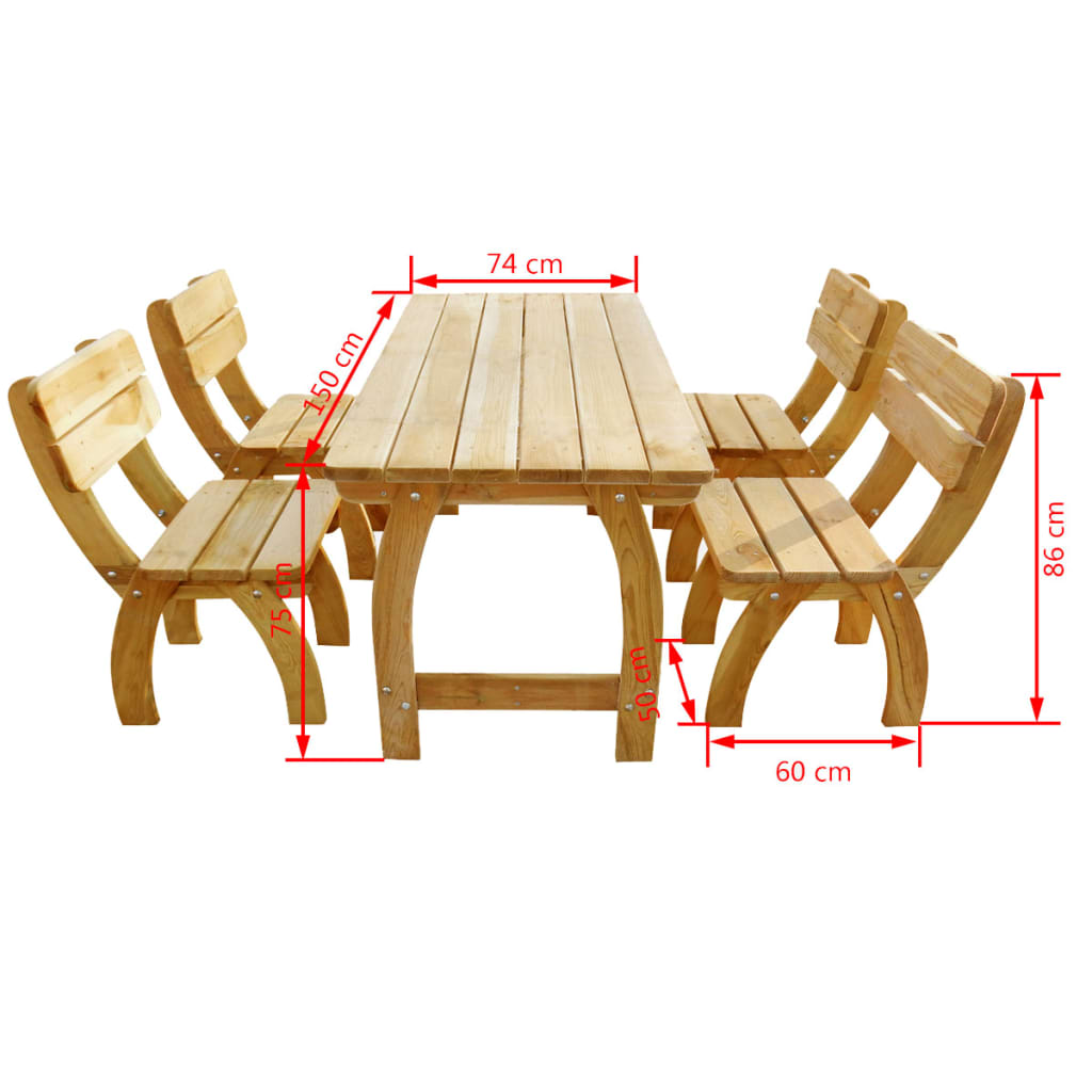 Dieses stilvolle Gartenmöbel-Set wird Ihrem Außenbereich einen rustikalen Charme verleihen. Da das Set aus qualitativ hochwertigem, grün imprägniertem Kiefernholz gefertigt ist, ist es stabil, belastbar und verrottet nicht. Die Lieferung umfasst 1 Tisch und 4 Stühle. Die Montage ist sehr einfach. Bitte beachten Sie, dass Holz ein Naturprodukt ist und somit Unvollkommenheiten aufweisen kann.