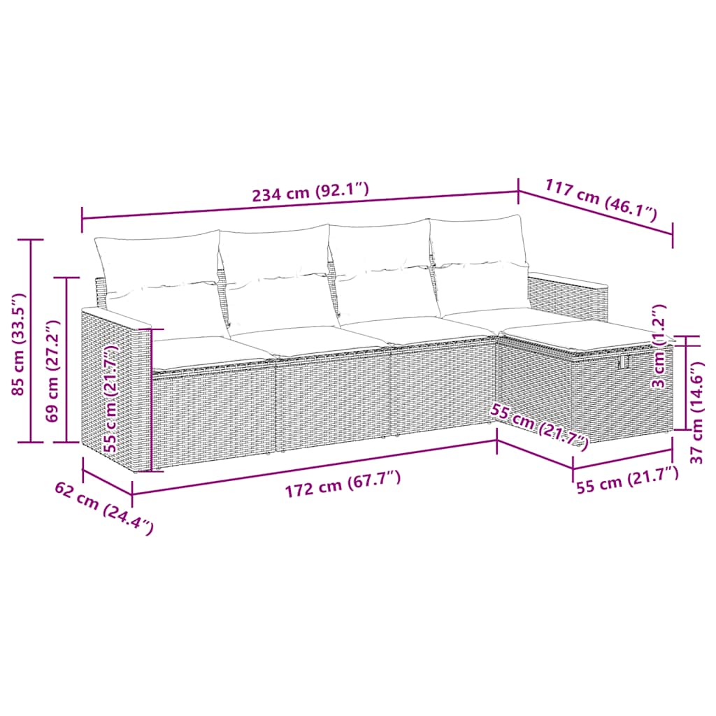 Diese Garten-Sofagarnitur ist die perfekte Ergänzung zu deinem Garten, deiner Terrasse oder deinem Innenhof. Sie bietet einen bequemen und einladenden Platz, um mit Familie und Freunden zu plaudern oder dich einfach nur zu entspannen und das Leben im Freien zu genießen. Langlebiges Material: PE-Rattan, auch als Poly Rattan bekannt, ist ein robustes, pflegeleichtes synthetisches Material, das die Optik von natürlichem Rattan aufweist. Es kennzeichnet sich durch ein geringes Eigengewicht und lässt sich einfach reinigen. Aufgrund seiner Haltbarkeit und Witterungsbeständigkeit wird es häufig bei der Herstellung von Gartenmöbeln verwendet.Stauraum mit wasserfestem Beutel: Jedes Gartensofa verfügt über ein Staufach unter der Sitzfläche, das mit einem wasserfesten Beutel zur Aufbewahrung von Kissen, Spielzeug und anderen Gegenständen versehen ist. Die Kissen sind mit Bezügen versehen und lassen sich mit Klettverschlüssen fest und sicher am Sofa befestigen.Vielseitiger Fußhocker: Der Hocker ist vielseitig einsetzbar und dient als bequeme Fußstütze beim Entspannen auf dem Sofa oder als zusätzlicher Sitzplatz in deinem Garten.Abnehmbarer und waschbarer Bezug: Diese Sitzkissen verfügen über abnehmbare Bezüge für einfaches Waschen und Pflegen.Robustes und stabiles Gestell: Der pulverbeschichtete Stahlgestell ist stark, stabil, langlebig sowie korrosions- und wetterbeständig, um eine lang anhaltende Leistung zu gewährleisten. Gut zu wissen:Wir empfehlen dir, deine Gartenmöbel mit einer wasserdichten Hülle zu schützen, um lange Zeit eine ansprechende Optik aufzuweisen.