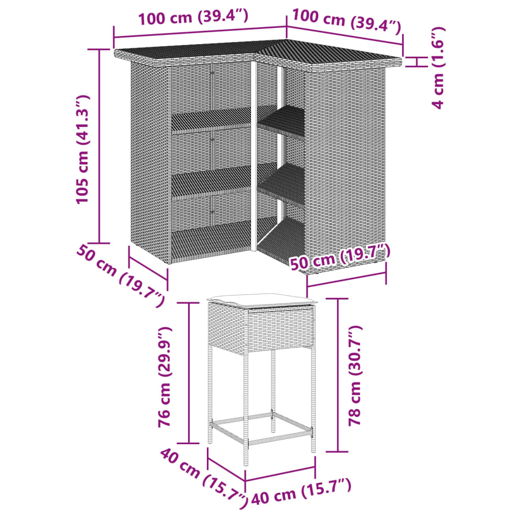 Dieses trendige Gartenbar-Set vereint Stil und Funktionalität und wird ein echter Hingucker in deinem Garten, auf deiner Terrasse oder in jedem anderen Außenbereich sein. Langlebiges Material: PE-Rattan, auch als Poly Rattan bekannt, ist ein robustes, pflegeleichtes synthetisches Material, das die Optik von natürlichem Rattan aufweist. Es kennzeichnet sich durch ein geringes Eigengewicht und lässt sich einfach reinigen. Aufgrund seiner Haltbarkeit und Witterungsbeständigkeit wird es häufig bei der Herstellung von Gartenmöbeln verwendet.Bequemes Sitzerlebnis: Dieser Gartensessel mit dick gepolsterten Kissen bietet ein angenehmes Sitzgefühl.Abnehmbarer und waschbarer Bezug: Diese Sitzkissen verfügen über abnehmbare Bezüge für einfaches Waschen und Pflegen.Robuster und stabiler Rahmen: Dank des pulverbeschichteten Stahlrahmens ist das Möbelstück robust, stabil und für den täglichen Einsatz im Außenbereich geeignet. Gut zu wissen:Wir empfehlen dir, deine Gartenmöbel mit einer wasserdichten Hülle zu schützen, um lange Zeit eine ansprechende Optik aufzuweisen.