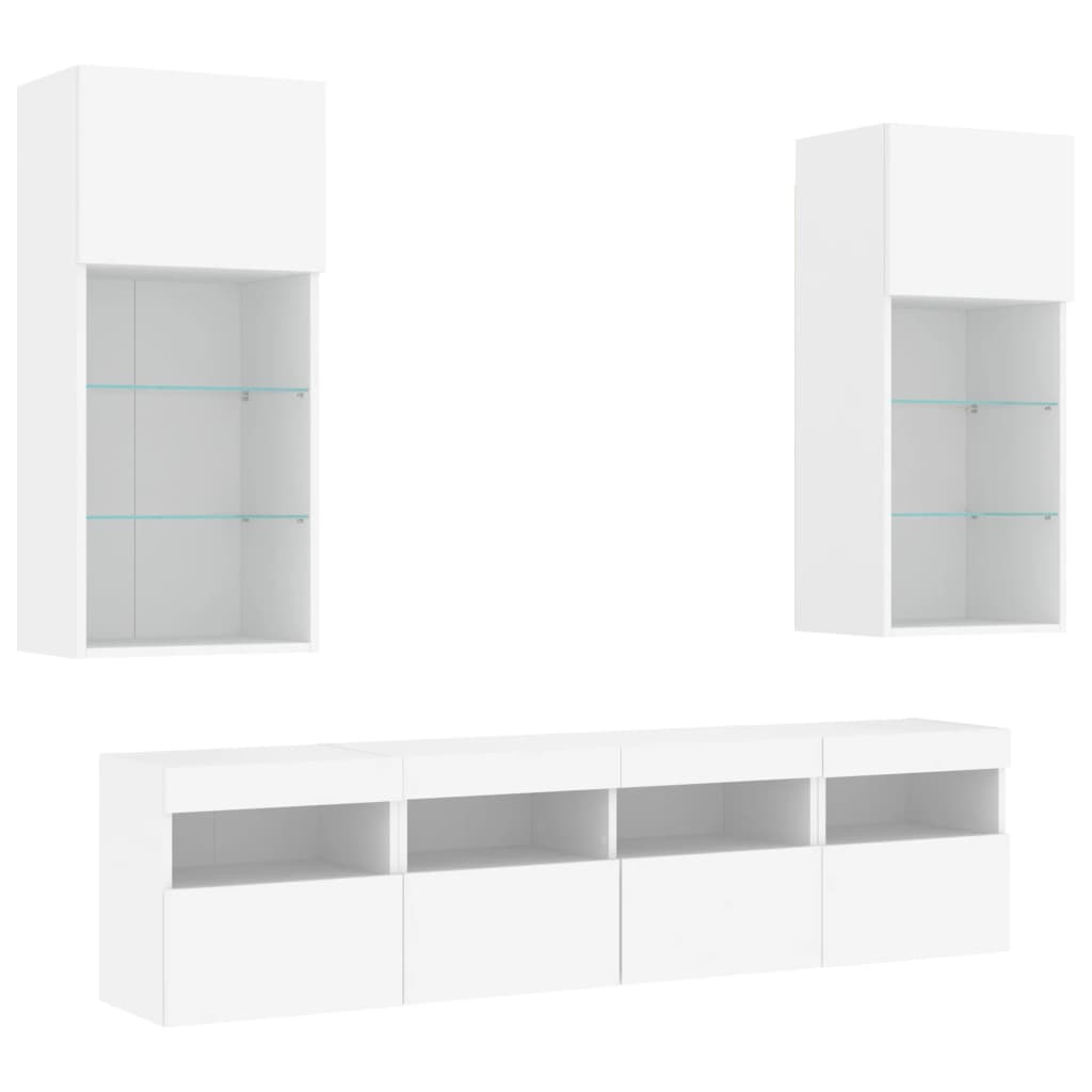 Diese TV-Wandschränke bieten eine perfekte Lösung, um zusätzlichen Stauraum in deinem Wohnraum zu schaffen und für Ordnung zu sorgen. Robustes Material: Holzwerkstoff ist ein Material von außergewöhnlicher Qualität mit glatter Oberfläche, das sich durch Festigkeit, Stabilität und Feuchtigkeitsbeständigkeit auszeichnet.RGB-LED-Leuchten: Die Wohnwand ist mit lebendigen RGB-LED-Leuchten ausgestattet. Mit verschiedenen anpassbaren Menüs kannst du die Farbe der Lichter mühelos wechseln und sie sogar auf automatische Anpassung einstellen. Diese LED-Leuchten unterstreichen nicht nur den modernen Look des TV-Wandschranks, sondern tragen auch zu seiner trendigen Optik bei.Wandmontage: Der TV-Schrank lässt sich an der Wand montieren, um zusätzlichen Stauraum zu schaffen. Auf diese Weise kannst du deine Bodenfläche maximieren und für Ordnung im Raum sorgen.Reichlich Stauraum: Das TV-Wandschrank-Set bietet reichlich Platz, um Bücher, DVDs, Zeitschriften, Medien und andere Alltagsgegenstände übersichtlich und griffbereit zu verstauen.Vielseitiges Design: Du kannst den Schrank als TV-Schrank verwenden oder ihn im Arbeitszimmer an der Wand montieren, um Utensilien oder andere Gegenstände bequem aufzubewahren. Zudem verwandelt er eine leere Wand sofort in ein Design-Element. Gut zu wissen:Schrauben und Dübel für die Innenseite der Wand sind nicht enthalten. Wir empfehlen dir, Schrauben und Dübel zu finden und zu verwenden, die speziell für deine Wände geeignet sind. Wenn du dir nicht sicher bist, kannst du dich an einen Fachmann wenden. Bitte lies und befolge jeden Schritt in der Anleitung.Das Produkt verfügt über einen USB-Anschluss, für den eine zertifizierte 5V-USB-Stromquelle erforderlich ist (nicht im Lieferumfang enthalten).