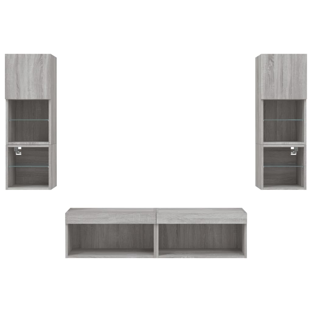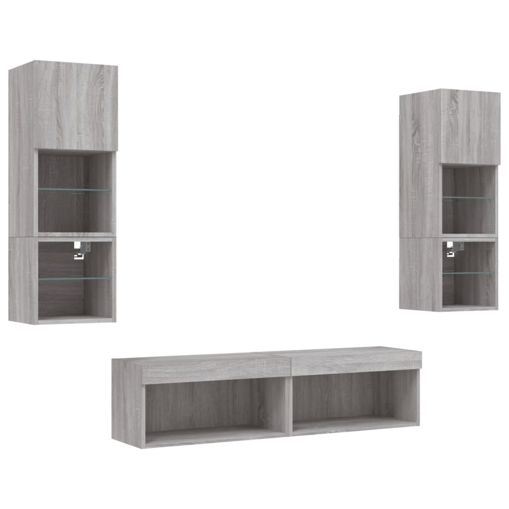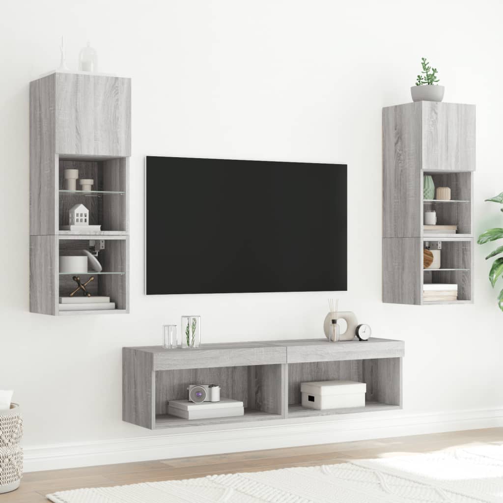 Diese TV-Wandschränke bieten eine perfekte Lösung, um zusätzlichen Stauraum in deinem Wohnraum zu schaffen und für Ordnung zu sorgen. Robustes Material: Holzwerkstoff ist ein Material von außergewöhnlicher Qualität mit glatter Oberfläche, das sich durch Festigkeit, Stabilität und Feuchtigkeitsbeständigkeit auszeichnet.RGB-LED-Leuchten: Die Wohnwand ist mit lebendigen RGB-LED-Leuchten ausgestattet. Mit verschiedenen anpassbaren Menüs kannst du die Farbe der Lichter mühelos wechseln und sie sogar auf automatische Anpassung einstellen. Diese LED-Leuchten unterstreichen nicht nur den modernen Look des TV-Wandschranks, sondern tragen auch zu seiner trendigen Optik bei.Wandmontage: Der TV-Schrank lässt sich an der Wand montieren, um zusätzlichen Stauraum zu schaffen. Auf diese Weise kannst du deine Bodenfläche maximieren und für Ordnung im Raum sorgen.Reichlich Stauraum: Das TV-Wandschrank-Set bietet reichlich Platz, um Bücher, DVDs, Zeitschriften, Medien und andere Alltagsgegenstände übersichtlich und griffbereit zu verstauen.Vielseitiges Design: Du kannst den Schrank als TV-Schrank verwenden oder ihn im Arbeitszimmer an der Wand montieren, um Utensilien oder andere Gegenstände bequem aufzubewahren. Zudem verwandelt er eine leere Wand sofort in ein Design-Element. Gut zu wissen:Schrauben und Dübel für die Innenseite der Wand sind nicht enthalten. Wir empfehlen dir, Schrauben und Dübel zu finden und zu verwenden, die speziell für deine Wände geeignet sind. Wenn du dir nicht sicher bist, kannst du dich an einen Fachmann wenden. Bitte lies und befolge jeden Schritt in der Anleitung.Das Produkt verfügt über einen USB-Anschluss, für den eine zertifizierte 5V-USB-Stromquelle erforderlich ist (nicht im Lieferumfang enthalten).