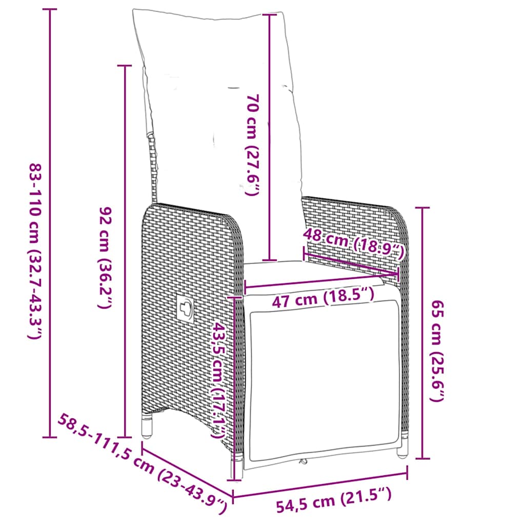 Verbessere deine Entspannung im Freien mit dem vidaXL Set von Reclining Gartenstühlen, aus schickem grauem Poly Rattan mit bequemen Kissen. Perfekt zum Sonnen und um mit Freunden abzuhängen, bringt dieses Set modernes Flair und praktische Nutzung, ideal für Balkone, Gärten oder Patios. Komfortable Sitz-Erfahrung: Dicke Kissen sorgen für bequeme Sitzplätze, ideal für lange Entspannungstage im Freien. Die abnehmbaren Bezüge erleichtern die Reinigung für deine Chill-Zeit. Robuste Bauweise: Aus hochwertigem PE Rattan und strapazierfähigem pulverbeschichtetem Stahl gemacht, können diese Stühle draußen genutzt werden, während sie ihren tollen Look beibehalten. Die Reinigung ist kinderleicht! Stylische Optik: Die elegante graue Farbe passt zu jedem Außenbereich und hebt die Atmosphäre deines Gartens, Patios oder Balkons hervor. Leicht und mobil: Obwohl sie stark sind, lassen sich diese Stühle gut bewegen, sodass du dein Setup für verschiedene Anlässe einfach ändern kannst. Optimale Maße: Für Komfort designt, passen die Maße zu vielen Nutzern und fügen sich gut in jedes Außenarrangement ein.