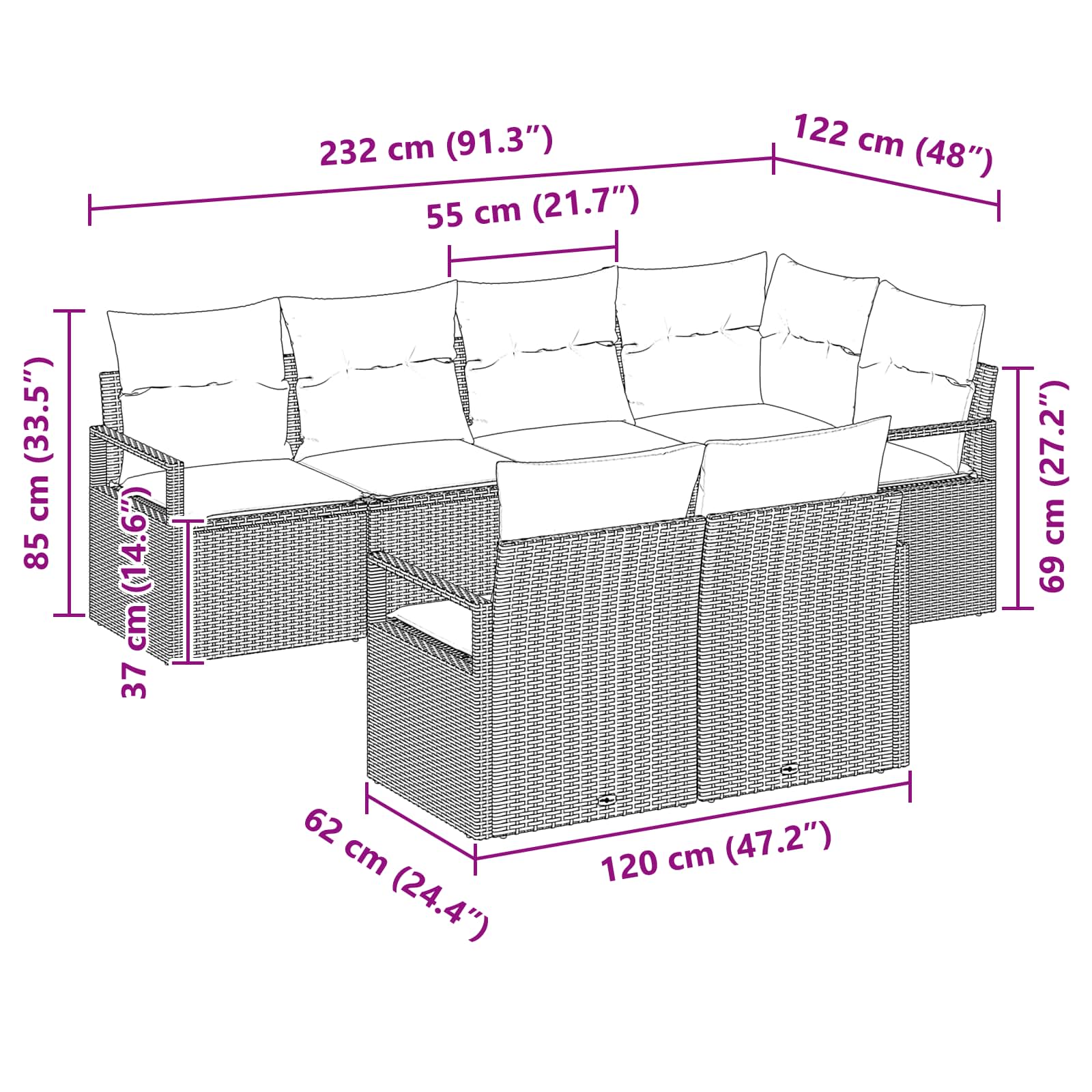 Dieses Gartensofa-Set ist eine coole Ergänzung für deinen Außenbereich und sorgt für ein komfortables Erlebnis. Mit seinem modernen Look und der modularen Anordnung kannst du es ganz nach deinen Vorstellungen auf deiner Terrasse oder deinem Balkon gestalten und einen gemütlichen Platz schaffen, um dich mit Freunden zu entspannen oder zu feiern. Modulares Design: Ändere die Sofa-Anordnung, um sie an deinen Außenbereich anzupassen. So kannst du flexibel auf verschiedene Events reagieren. Das ist ideal, wenn die Stimmung oder die Bedürfnisse in deinem Garten sich ändern. Wetterbeständiges Gewebe: Jeder Kissenbezug ist aus robustem, wetterfestem Stoff, der dafür sorgt, dass es stilvoll und bequem bleibt. Wichtig, um das Aussehen und das Gefühl bei unterschiedlichen Wetterbedingungen zu wahren. Verstellbare Füße in der Höhe: Das Sofa hat verstellbare Füße, damit du die Höhe auf unebenen Terrassen oder Balkonen anpassen kannst. So bleibt es stabil und bequem, selbst auf schwierigen Oberflächen. Handgefertigtes Finish: Das handgewebte Rattan macht jedes Teil einzigartig, steigert den Stil und sorgt gleichzeitig für Robustheit und Langlebigkeit. Einfache Wartung: Die Reinigung ist ganz einfach mit abwischbaren Oberflächen, so kannst du deine Outdoormöbel mühelos in Schuss halten ? perfekt für spontane Zusammenkünfte und alltägliche Nutzung.
