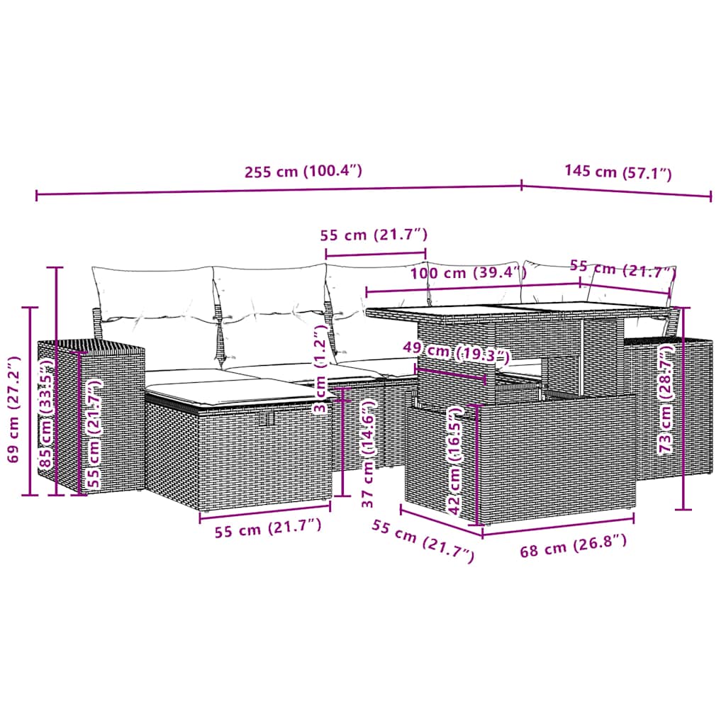 Dieses Gartensofa-Set ist die perfekte Ergänzung für Ihren Garten, Ihre Terrasse oder Ihren Innenhof und bietet einen komfortablen und einladenden Platz zum Plaudern mit Familie und Freunden oder einfach zum Entspannen und Genießen der Natur. Langlebiges Material: PE-Rattan, auch bekannt als Polyrattan, ist ein robustes, pflegeleichtes Kunststoffmaterial, das wie natürliches Rattan aussieht. Es ist leicht, einfach zu reinigen und wird aufgrund seiner Langlebigkeit und Wetterbeständigkeit häufig für Gartenmöbel verwendet.Verstellbare Tischplatte: Die Tischplatte kann angehoben werden, um den Tisch höher zu machen, wodurch der Gartentisch von einem Couchtisch in einen Esstisch verwandelt wird. Er eignet sich perfekt, um Gäste einzuladen oder draußen zu essen.Glastischplatte: Die Tischplatte des Gartentisches besteht aus starkem und langlebigem Hartglas, sodass sie sich leicht mit einem feuchten Tuch reinigen lässt und Ihrem Außenbereich einen Hauch von Eleganz verleiht.Abnehmbarer und waschbarer Bezug: Diese Sitzkissen verfügen über abnehmbare Bezüge, die sich leicht waschen und pflegen lassen.Modulares Design: Dieses Gartenmöbelset hat ein modulares Design, wodurch es völlig flexibel und leicht zu bewegen ist, sodass Sie eine individuelle Gartenmöbelanordnung erstellen können. Gut zu wissen:Damit Ihre Gartenmöbel schön bleiben, empfehlen wir Ihnen, sie mit einer wasserdichten Abdeckung zu schützen.