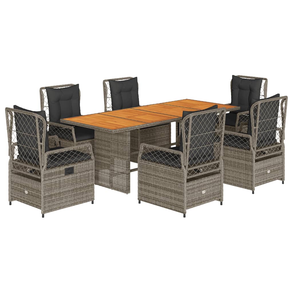 Diese Garten-Essgruppe ist eine ideale Wahl für Mahlzeiten im Freien oder einfach nur zum Entspannen im Garten, Hinterhof oder auf der Terrasse. Langlebiges Material: PE-Rattan, auch als Poly Rattan bekannt, ist ein robustes, pflegeleichtes synthetisches Material, das die Optik von natürlichem Rattan aufweist. Es kennzeichnet sich durch ein geringes Eigengewicht und lässt sich einfach reinigen. Aufgrund seiner Haltbarkeit und Witterungsbeständigkeit wird es häufig bei der Herstellung von Gartenmöbeln verwendet.Verstellbare Rückenlehne: Der Gartensessel ist mit einem Griff versehen. So kannst du die Rückenlehne durch Ziehen des Griffs verstellen und sie danach schnell wieder in ihre ursprüngliche Position bringen.Bequemes Sitzerlebnis: Dieser Gartensessel mit dick gepolsterten Kissen bietet ein angenehmes Sitzgefühl.Abnehmbarer und waschbarer Bezug: Das Sitzkissen verfügt über einen abnehmbaren Bezug, der sich ganz einfach waschen und pflegen lässt.Stabile und pflegeleichte Tischplatte: Dieser Gartentisch besitzt eine Tischplatte aus Akazienholz, die robust und langlebig ist und sich leicht mit einem feuchten Tuch reinigen lässt. Gut zu wissen:Wir empfehlen dir, deine Gartenmöbel mit einer wasserdichten Hülle zu schützen, um lange Zeit eine ansprechende Optik aufzuweisen.
