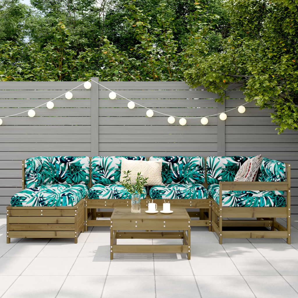 Dieses Garten-Lounge-Set aus Holz mit Latten-Design ist eine großartige Bereicherung für deinen Garten, deine Terrasse oder deinen Balkon, um eine gemütliche Zeit mit der Familie oder Freunden zu verbringen. Robustes und langlebiges Material: Massives Kiefernholz ist für seine Stärke und Haltbarkeit bekannt. Seine gerade Maserung und die charakteristischen Aststellen tragen zu seinem rustikalen Charme bei. Es wurde mit einer Konservierungslösung imprägniert und mit Autoklaven behandelt, um eine höhere Verrottungs- und Witterungsbeständigkeit zu besitzen. Gute Belüftung und Verhinderung von Ansammlungen: Das Latten-Design sorgt für eine optimale Luftzirkulation und verhindert effektiv, dass sich Wasser ansammelt, wodurch die Sitzfläche stets bequem trocken bleibt. Vielseitig einsetzbar: Der Gartenhocker lässt sich als Sitzgelegenheit oder zum Ausruhen der Füße verwenden, kann aber auch als Couchtisch für Getränke, Snacks oder Dekorationen dienen. Modulares Design: Dank des modularen Designs lassen sich die Gartenmöbel völlig flexibel und einfach umstellen, um deinen Außenbereich ganz individuell zu gestalten. Gut zu wissen:Wir empfehlen dir, deine Gartenmöbel mit einer wasserdichten Hülle zu schützen, um lange Zeit eine ansprechende Optik aufzuweisen.
