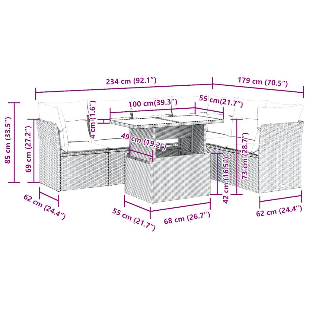 Diese Garten-Sofagarnitur ist die perfekte Ergänzung zu deinem Garten, deiner Terrasse oder deinem Innenhof. Sie bietet einen bequemen und einladenden Platz, um mit Familie und Freunden zu plaudern oder dich einfach nur zu entspannen und das Leben im Freien zu genießen. Langlebiges Material: PE-Rattan, auch als Poly Rattan bekannt, ist ein robustes, pflegeleichtes synthetisches Material, das die Optik von natürlichem Rattan aufweist. Es kennzeichnet sich durch ein geringes Eigengewicht und lässt sich einfach reinigen. Aufgrund seiner Haltbarkeit und Witterungsbeständigkeit wird es häufig bei der Herstellung von Gartenmöbeln verwendet.Stauraum mit wasserfestem Beutel: Jedes Gartensofa verfügt über ein Staufach unter der Sitzfläche, das mit einem wasserfesten Beutel zur Aufbewahrung von Kissen, Spielzeug und anderen Gegenständen versehen ist. Die Kissen sind mit Bezügen versehen und lassen sich mit Klettverschlüssen fest und sicher am Sofa befestigen.Verstellbare Tischplatte: Die Tischplatte lässt sich anheben, um den Gartentisch höher zu machen und ihn von einem Couchtisch in einen Esstisch zu verwandeln. Er eignet sich daher perfekt für Gäste oder Mahlzeiten im Freien.Abnehmbarer und waschbarer Bezug: Diese Sitzkissen verfügen über abnehmbare Bezüge für einfaches Waschen und Pflegen.Robustes und stabiles Gestell: Der pulverbeschichtete Stahlgestell ist stark, stabil, langlebig sowie korrosions- und wetterbeständig, um eine lang anhaltende Leistung zu gewährleisten. Gut zu wissen:Wir empfehlen dir, deine Gartenmöbel mit einer wasserdichten Hülle zu schützen, um lange Zeit eine ansprechende Optik aufzuweisen.
