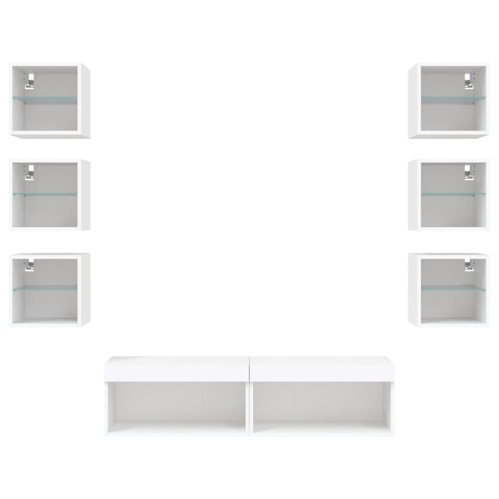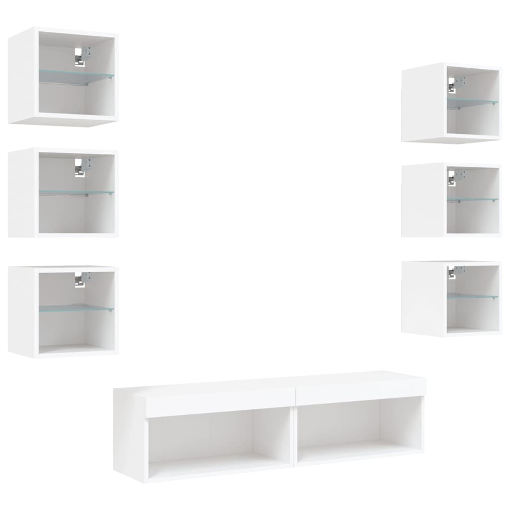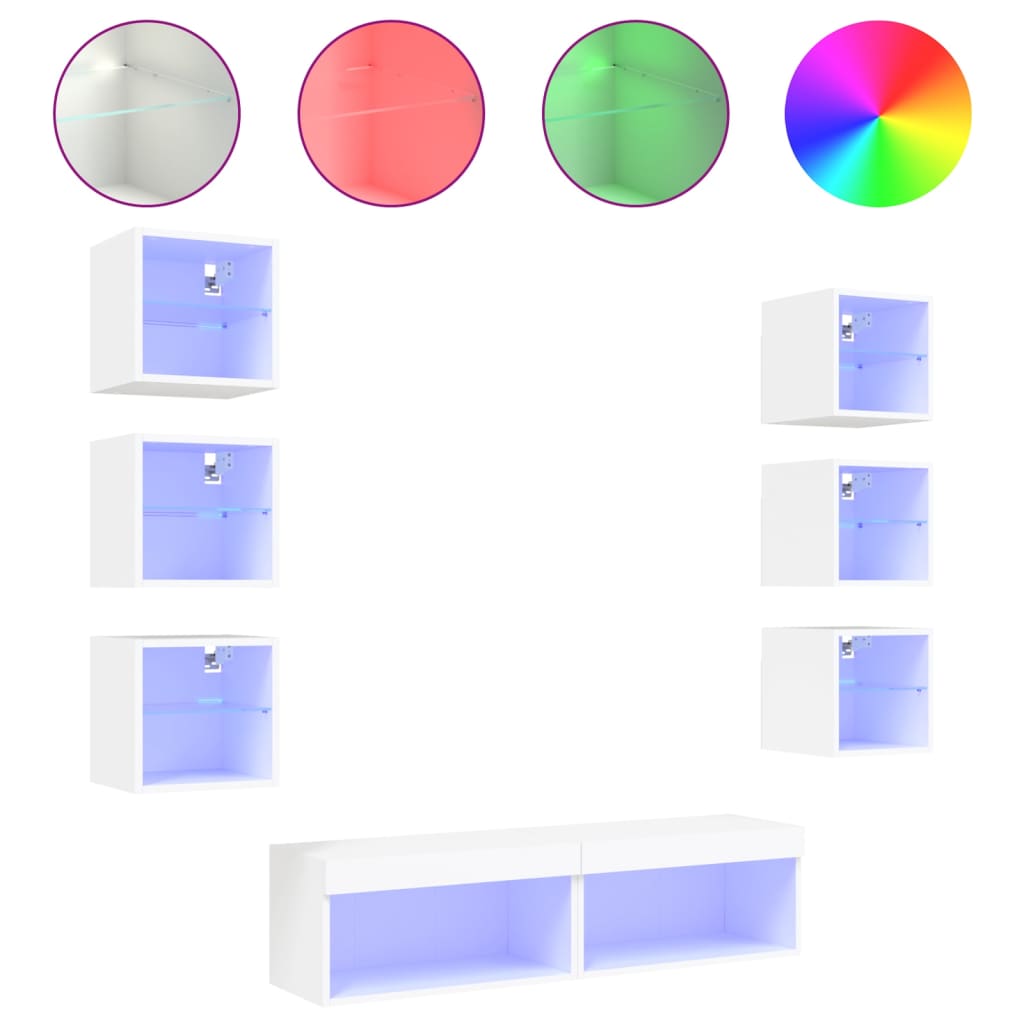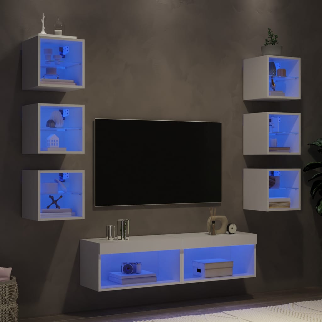 Diese TV-Wandschränke bieten eine perfekte Lösung, um zusätzlichen Stauraum in deinem Wohnraum zu schaffen und für Ordnung zu sorgen. Robustes Material: Holzwerkstoff ist ein Material von außergewöhnlicher Qualität mit glatter Oberfläche, das sich durch Festigkeit, Stabilität und Feuchtigkeitsbeständigkeit auszeichnet.RGB-LED-Leuchten: Die Wohnwand ist mit lebendigen RGB-LED-Leuchten ausgestattet. Mit verschiedenen anpassbaren Menüs kannst du die Farbe der Lichter mühelos wechseln und sie sogar auf automatische Anpassung einstellen. Diese LED-Leuchten unterstreichen nicht nur den modernen Look des TV-Wandschranks, sondern tragen auch zu seiner trendigen Optik bei.Wandmontage: Der TV-Schrank lässt sich an der Wand montieren, um zusätzlichen Stauraum zu schaffen. Auf diese Weise kannst du deine Bodenfläche maximieren und für Ordnung im Raum sorgen.Reichlich Stauraum: Das TV-Wandschrank-Set bietet reichlich Platz, um Bücher, DVDs, Zeitschriften, Medien und andere Alltagsgegenstände übersichtlich und griffbereit zu verstauen.Vielseitiges Design: Du kannst den Schrank als TV-Schrank verwenden oder ihn im Arbeitszimmer an der Wand montieren, um Utensilien oder andere Gegenstände bequem aufzubewahren. Zudem verwandelt er eine leere Wand sofort in ein Design-Element. Gut zu wissen:Schrauben und Dübel für die Innenseite der Wand sind nicht enthalten. Wir empfehlen dir, Schrauben und Dübel zu finden und zu verwenden, die speziell für deine Wände geeignet sind. Wenn du dir nicht sicher bist, kannst du dich an einen Fachmann wenden. Bitte lies und befolge jeden Schritt in der Anleitung.Das Produkt verfügt über einen USB-Anschluss, für den eine zertifizierte 5V-USB-Stromquelle erforderlich ist (nicht im Lieferumfang enthalten).