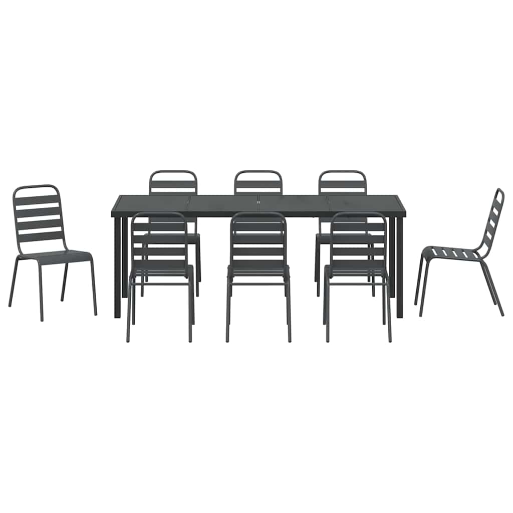 Mach dein Outdoor-Essen besser mit dem vidaXL 9-teiligen Garten-Esstischset, das Style und Praktikabilität in Anthrazit kombiniert. Enthält 4 stapelbare Gartenstühle und einen großen Esstisch, perfekt für Zusammenkünfte und tägliche Mahlzeiten.