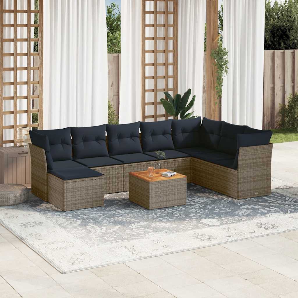 Dieses Gartensofa-Set ist die perfekte Ergänzung für Ihren Garten, Ihre Terrasse oder Ihren Innenhof und bietet einen komfortablen und einladenden Platz zum Plaudern mit Familie und Freunden oder einfach zum Entspannen und Genießen der Natur. Langlebiges Material: PE-Rattan, auch bekannt als Polyrattan, ist ein robustes, pflegeleichtes Kunststoffmaterial, das wie natürliches Rattan aussieht. Es ist leicht, einfach zu reinigen und wird aufgrund seiner Langlebigkeit und Wetterbeständigkeit häufig für Gartenmöbel verwendet.Aufbewahrungsfunktion mit wasserabweisender Tasche: Jeder Gartensitz verfügt über Stauraum unter dem Sitz, komplett mit einer wasserabweisenden Tasche zur Aufbewahrung von Kissen, Spielzeug und anderen Gegenständen. Die Innentaschen haben eine Abdeckung und können für zusätzliche Stabilität mit Klettverschlüssen sicher an den Sitzen befestigt werden.Stabile und pflegeleichte Tischplatte: Dieser Gartentisch hat eine Tischplatte aus Akazienholz, die robust, langlebig und mit einem feuchten Tuch leicht zu reinigen ist.Vielseitiger Fußhocker: Der Hocker ist vielseitig einsetzbar und dient als bequeme Fußstütze beim Entspannen auf dem Sofa oder als zusätzliche Sitzgelegenheit in Ihrem Garten.Modulares Design: Dieses Gartenmöbel-Set ist modular aufgebaut und daher völlig flexibel und leicht zu bewegen, sodass Sie eine individuelle Gartenmöbelanordnung erstellen können. Gut zu wissen:Damit Ihre Gartenmöbel schön bleiben, empfehlen wir Ihnen, sie mit einer wasserdichten Abdeckung zu schützen.