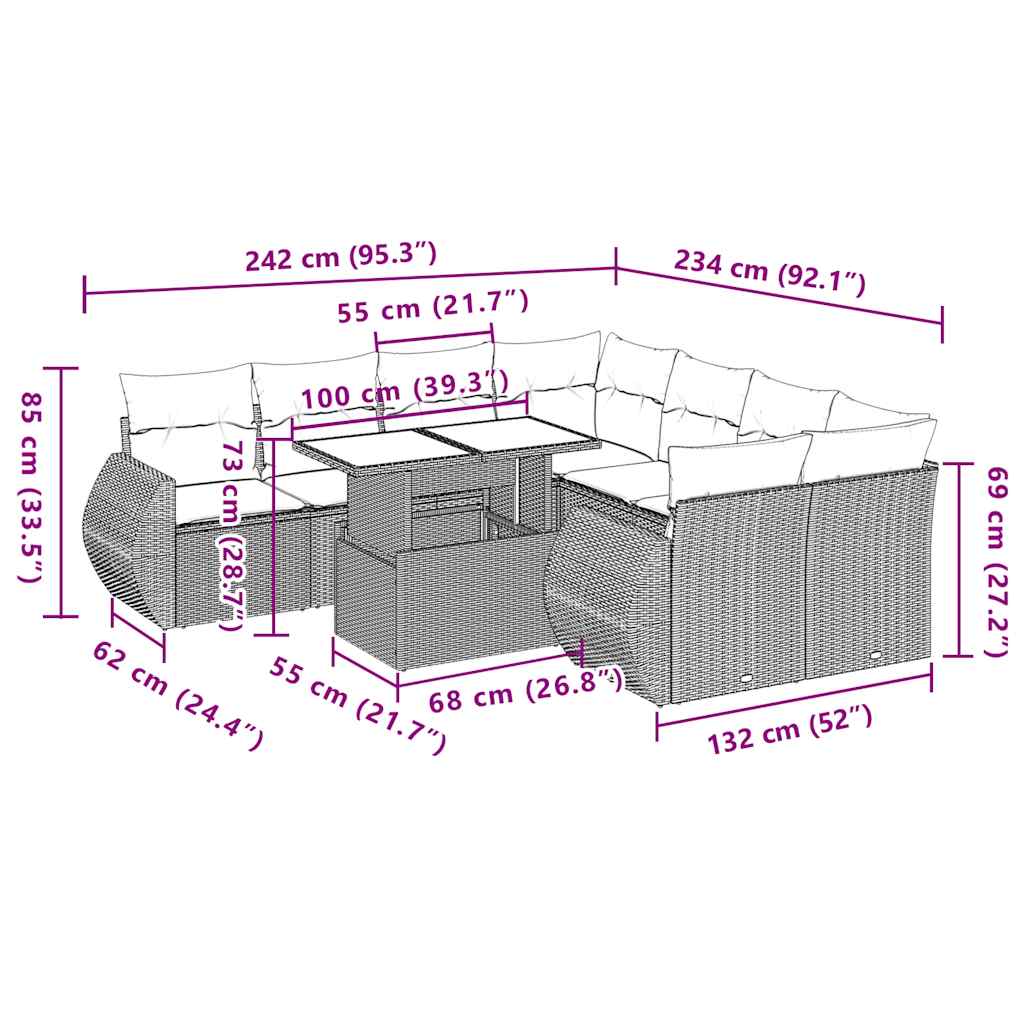 Dieses Gartensofa-Set ist die perfekte Ergänzung für Ihren Garten, Ihre Terrasse oder Ihren Innenhof und bietet einen komfortablen und einladenden Platz zum Plaudern mit Familie und Freunden oder einfach zum Entspannen und Genießen der Natur. Langlebiges Material: PE-Rattan, auch bekannt als Polyrattan, ist ein robustes, pflegeleichtes Kunststoffmaterial, das wie natürliches Rattan aussieht. Es ist leicht, einfach zu reinigen und wird aufgrund seiner Langlebigkeit und Wetterbeständigkeit häufig für Gartenmöbel verwendet.Verstellbare Tischplatte: Die Tischplatte kann angehoben werden, um den Tisch höher zu stellen, wodurch der Gartentisch von einem Couchtisch in einen Esstisch verwandelt wird. Es ist perfekt, um Gäste zu empfangen oder draußen zu essen.Bequemes Sitzerlebnis: Diese Gartenmöbel mit dick gepolsterten Kissen bieten ein bequemes Sitzerlebnis.Abnehmbarer und waschbarer Bezug: Diese Sitzkissen verfügen über abnehmbare Bezüge zum einfachen Waschen und Pflegen.Modulares Design: Dieses Gartenmöbelset hat ein modulares Design, wodurch es völlig flexibel und leicht zu bewegen ist, sodass Sie eine individuelle Gartenmöbelanordnung erstellen können. Gut zu wissen:Damit Ihre Gartenmöbel schön bleiben, empfehlen wir Ihnen, sie mit einer wasserdichten Abdeckung zu schützen.