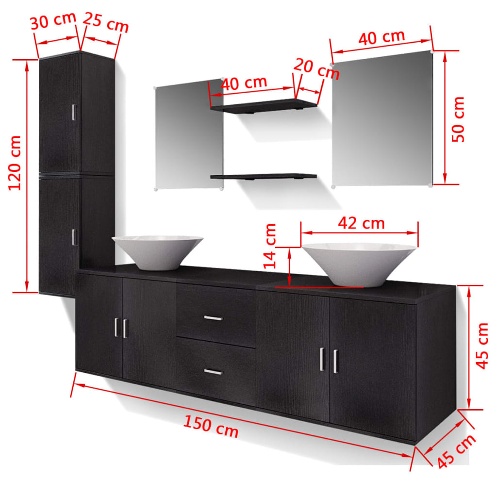 Dieses komplette Set, bestehend aus 1 Wand-Waschbeckenschrank, 2 Wandschränke, 2 Spiegel, 2 Regale und 2 Waschbecken, wird eine große Ergänzung zu Ihrem Badezimmer, die Optimierung Ihres Raumes ohne Kompromisse bei Stil. Die Wandschränke und der Beckenschrank mit zwei Schubladen bieten reichlichen Platz für das speichern von Ihren Toilettenartikel, Beauty-Produkte und verschiedene Arten von kleineren Gegenständen an. Kämme, Kosmetika, Zahnbürsten und Zahnpasta können in den Regalen bequem in Reichweite organisiert werden. Aus hochwertigem Holzwerkstoff ist diese Waschtisch-Einheit sehr stabil und langlebig. Die beiden Becken sind aus hochwertiger Keramik gefertigt, damit sie kratzfest, korrosionsbeständig und leicht zu reinigen sind. Sie eignen sich für die Montage über der Arbeitsplatte. Montage ist wirklich einfach. Die Lieferung beinhaltet auch zwei Pop-up-Ablassschrauben und Montagezubehör. Bitte beachten Sie: Die Armaturen sind nicht im Lieferumfang enthalten. Die Löcher für die Armaturen werden nicht vorgebohrt.