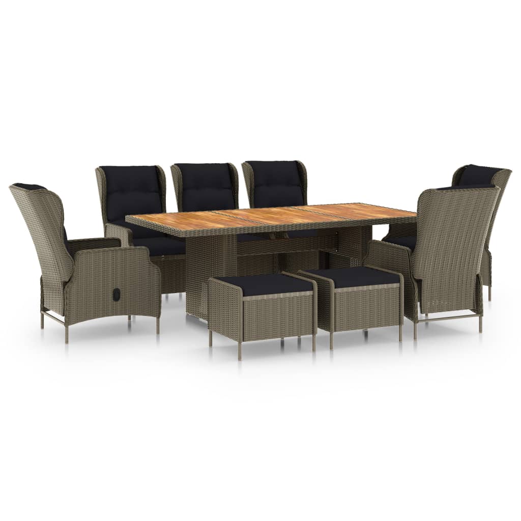 Diese stilvolle Essgruppe ist die perfekte Kombination aus Stil und Funktionalität und wird ein echter Hingucker in Ihrem Garten oder auf der Terrasse bzw. dem Balkon sein! Das Möbelset besteht aus leichtgewichtigem und pflegeleichtem rundem PE-Rattan und eignet sich daher nicht nur perfekt für den Außenbereich, sondern lässt sich mit einem feuchten Tuch auch einfach reinigen. Dank der pulverbeschichteten Stahlrahmen sind die Sessel und der Tisch stabil und langlebig. Die Tischplatte aus massivem Akazienholz eignet sich perfekt, um Mahlzeiten im Freien zu genießen oder Dekoartikel zur Schau zu stellen. Die verstellbaren Sessel mit dicken Auflagen bieten einen äußerst gemütlichen und angenehmen Platz zum Entspannen. Die Bezüge der Auflagen sind mit einem Reißverschluss versehen und daher abnehmbar und waschbar. Dank des Gasfedermechanismus lässt sich die Rückenlehne an Ihre Sitz- und Liegepositionen anpassen und kann durch Berühren des seitlichen Knopfes zurückgelehnt werden, um für eine bequeme Liegeposition zu sorgen. Daher eignet sich der Sessel perfekt zum Entspannen. Auf den passenden Fußhocker können Sie sogar Ihre Füße hochlegen. Das Set können Sie an jedem beliebigen Ort platzieren. Hinweis: Wir empfehlen, das Set bei Regen, Schnee oder Frost abzudecken.