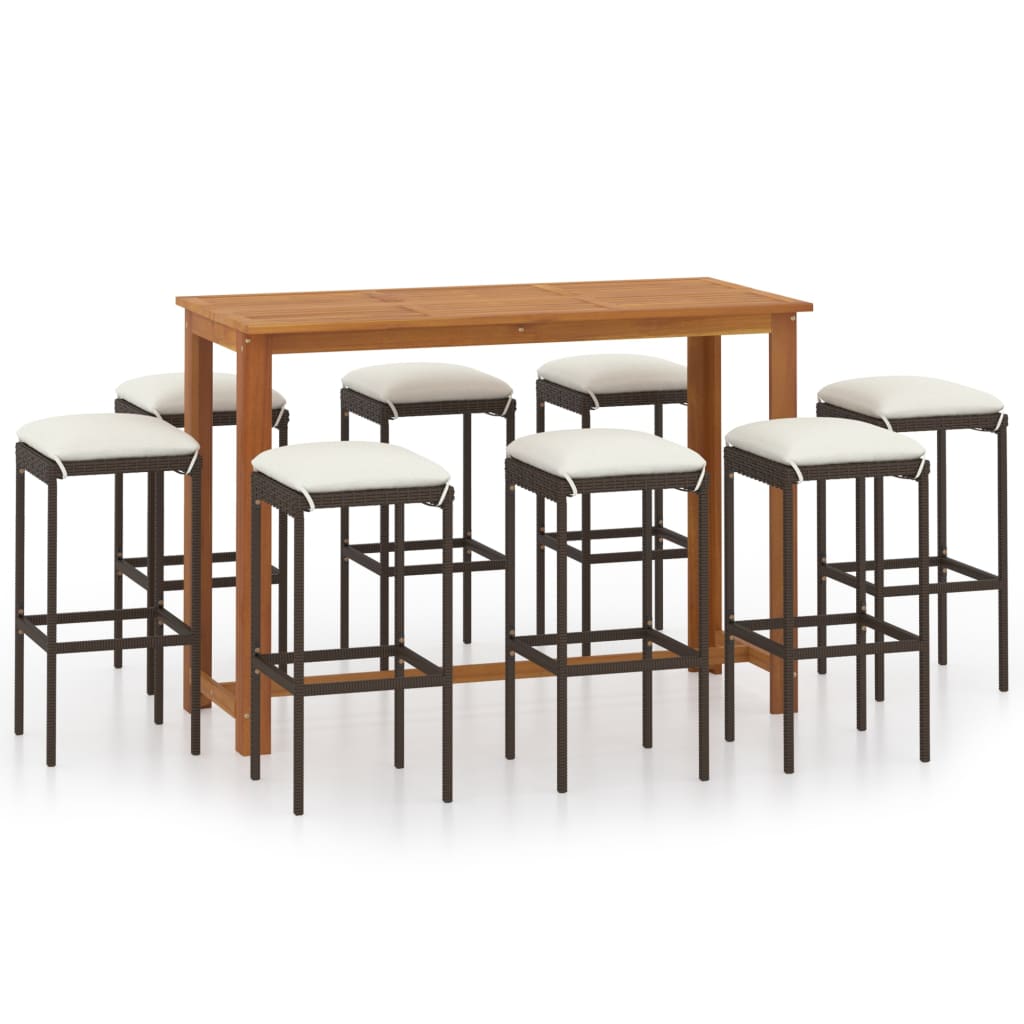 Dieses Gartenbar-Set weist ein elegantes Design auf und wird ganz bestimmt der neue Blickfang in Ihrem Garten, auf dem Balkon oder auf Ihrer Terrasse sein. Der Tisch besteht aus massivem Akazienholz, das mit Öl behandelt ist. Somit ist er stabil, langlebig und pflegeleicht. Die Barhocker verfügen über ein pulverbeschichtetes Stahlgestell, das mit wetterbeständigem PE-Rattan überzogen ist, und sind daher robust und leicht zu reinigen. Die dicken, abnehmbaren Sitzkissen sorgen für höchsten Komfort. Dank Reißverschlüsse lassen sich die Kissenbezüge leicht abnehmen und waschen. Hinweis: Wir empfehlen, das Set bei Regen, Schnee und Frost abzudecken.