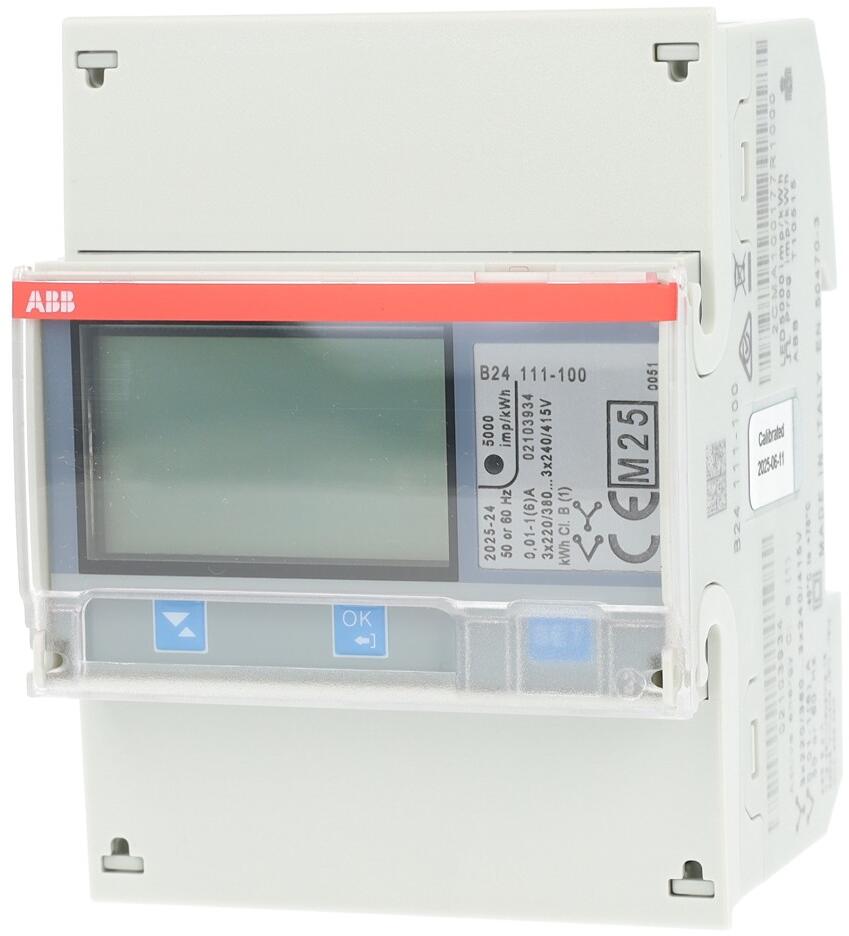 Drehstromzähler zur Messung eines Dreileiter- oder Vierleiter-Drehstromnetzes über einen Wandler-Anschluss CT (Wandlerverhältnis für Strom konfigurierbar) bis maximal 6 A. Folgende Werte werden über eine Siebensegmentanzeige mit bis zu 7 Stellen ausgegeben: Wirkenergie (Klasse 1), Leistungen, Ströme, Spannungen (L-L; L-N) und Frequenz, sowohl je Phase als auch gesamt. Die Kommunikation kann über die Infrarotschnittstelle zur Anbindung eines KNX-Moduls erfolgen. Der Energiezähler hat einen Ausgang. Dieser kann wahlweise als Impulsausgang zur Ausgabe der Wirkenergie oder als Alarmausgang verwendet werden. Hier können bis zu 25 Alarmwerte (Schwellwerte mit Zeitverzögerung) eingestellt werden. Der Zähler ist geeicht nach MID und zugelassen gemäß IEC. Die Einbaubreite beträgt 4 DIN-Module.