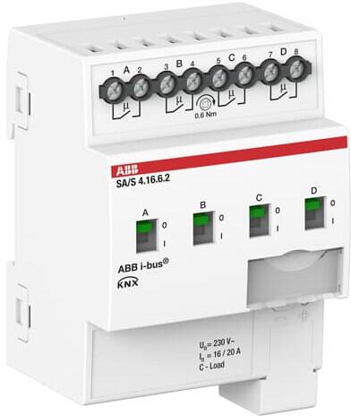 Schaltet mit potenzialfreien Kontakten 4 unabhängige elektrische Verbraucher über ABB i-bus® KNX. Der Schaltaktor verfügt über eine integrierte Energiefunktion und besitzt pro Ausgang eine Strommessung. Dies beinhaltet eine einfach zu nutzende Berechnung von Leistung- und Energieverbrauch pro Ausgang oder Gruppe von Ausgängen. Mit einem integrierten Laststeuer-Objekt wird eine einfache Integration in ein Lastmanagementsystem ermöglicht. Jeder Ausgang kann per Hand bedient werden und besitzt eine Schaltstellungsanzeige. Das 16/20A, 16A-AC3 (C-Last) Gerät ist besonders geeignet zum Schalten von Lasten mit hohen Einschaltstromspitzen z. B. LED-Leuchtmittel oder Leuchtstofflampenlasten.
