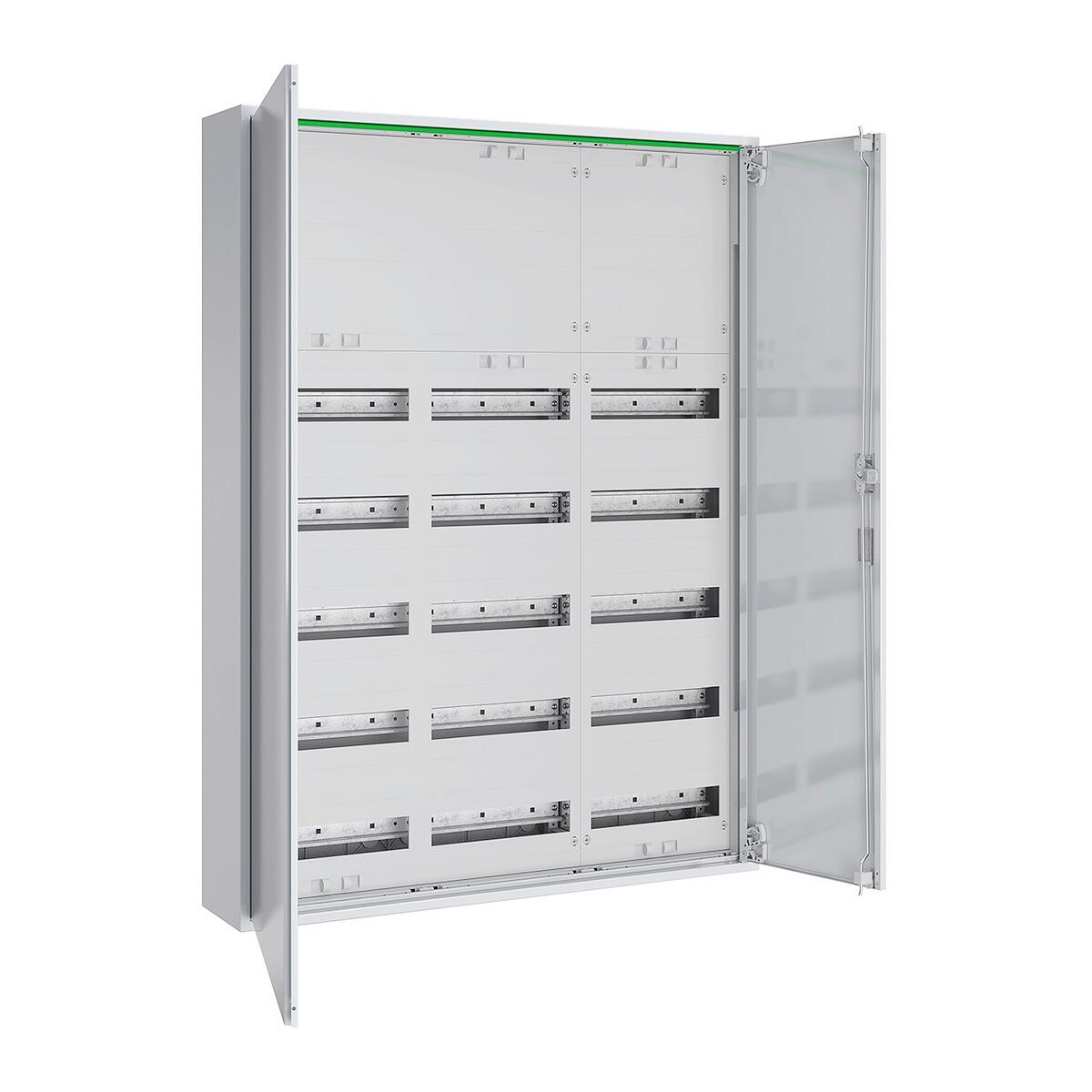 Komplettschrank für Aufputzmontage bestehend aus: RM-Gehäuse mit Volltür, 3x Verteilerfeld 5-reihig, 180 TE, für Reiheneinbaugeräte, mit geschlossener Abdeckung und isolierten Gerätetragschienen für Reihenklemmen, IP44.