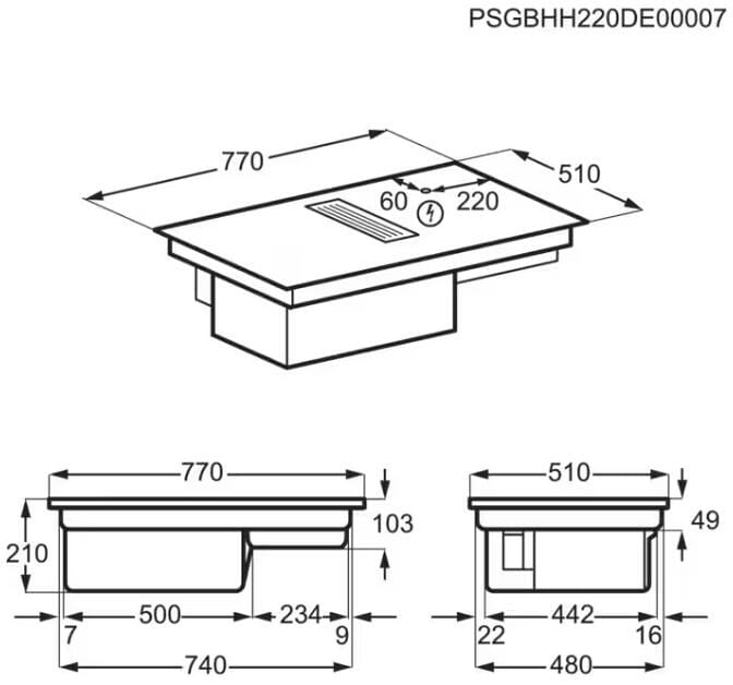 - Kochzone vorne links (kW / Ø cm): 2300/3200W/210mm