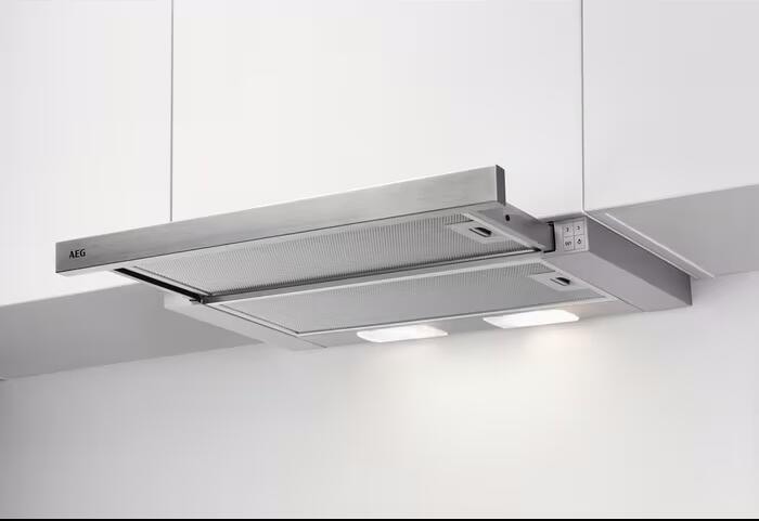 AEG DPS362AS EEK: C Extractor 3000 Flachschirmhaube, 60 cm breit, 330 m³/h, LED-Beleuchtung, Drucktasten, Abluft- und Umluftbetrieb, grau