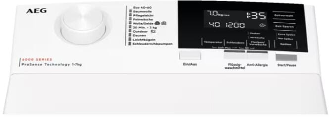 AEG LTR6A60370 7kg Toplader Waschmaschine, 40 cm breit, 1300 U./min, ProSense Mengenautomatik, SoftPlus-Option, weiß