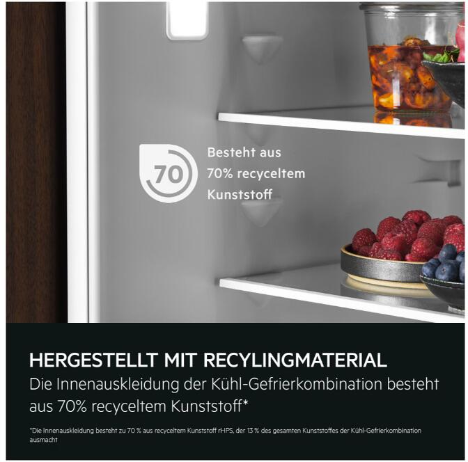 Die 7000 NoFrost KI CoolAssist Kühl-Gefrierkombination ist die ideale Lösung für alle, die Wert auf intelligente und nachhaltige Kühlung legen. Dank der innovativen KI CoolAssist-Technologie passt sich das Gerät automatisch an deinen Lebensstil an, indem es die Kühltemperatur und Funktionen selbstständig reguliert. Die TwinTech® No Frost-Technologie sorgt dafür, dass das Abtauen des Gefrierteils der Vergangenheit angehört, während die Cooling 360°-Technologie eine gleichmäßige Kühlung im gesamten Kühlschrank gewährleistet. Die Verwendung von 70 % recyceltem Kunststoff in der Innenauskleidung unterstreicht das Engagement für Nachhaltigkeit und Umweltfreundlichkeit.