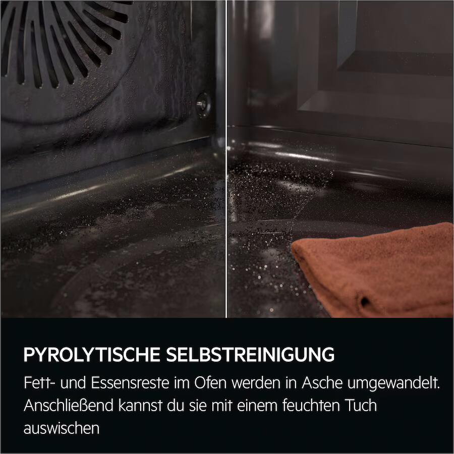 Mit Aktivierung der Pyrolyse-Selbstreinigungsfunktion werden Schmutz, Fett und Essensreste im Ofen in Asche umgewandelt. Anschließend kannst du diese mühelos mit einem feuchten Tuch auswischen.