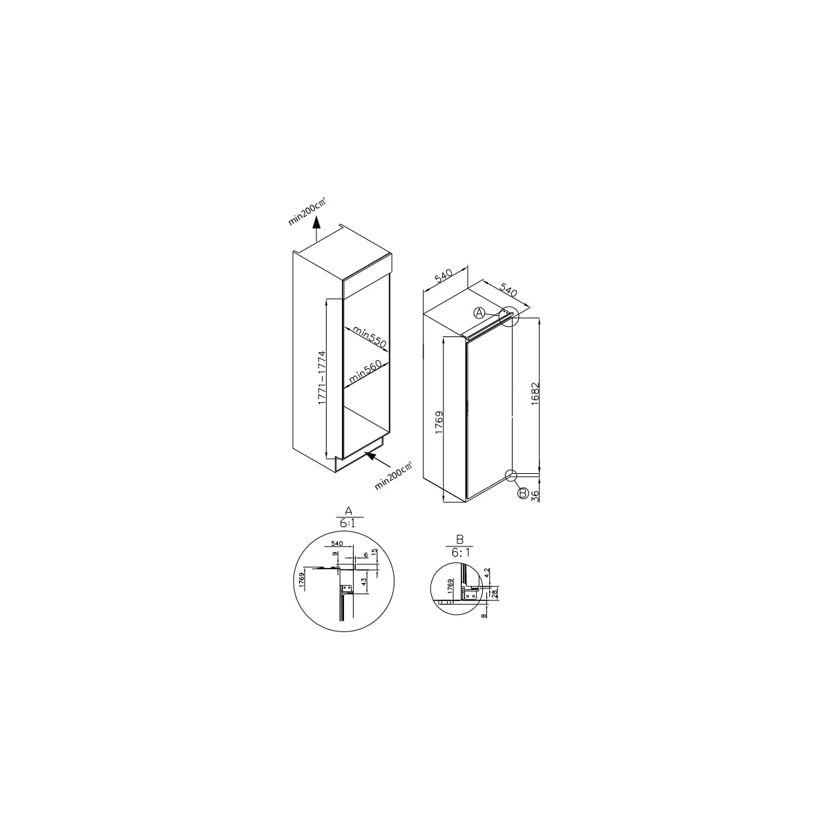 - Gerätemaße H x B x T (mm): 1769 x 540 x 540