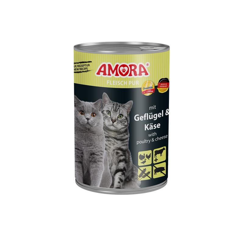 AMORA Fleisch pur ist eine hochwertige Vollnahrung, die ausschließlich aus Fleischstücken und Innereien hergestellt wird.AMORA Fleisch pur enthält besonders viel tierisches Eiweiß, Vitamine und Mineralstoffe. AMORA Fleisch pur enthält keine Aroma-, Farb- und Konservierungsstoffe.Hergestellt in Deutschland.Alleinfuttermittel für Katzen.Zusammensetzung: 55 % Geflügel (Fleisch, fleischige Hälse, Leber, Mägen, Herzen), 28,16 % Geflügelbrühe, 15 % Rind (Lunge, Fleisch, Leber, Herz, Niere), 0,84 % Käsepulver (entspricht 4 % Käse), Mineralstoffe, Distelöl. Kann Spuren anderer Zutaten enthalten.Analytische Bestandteile: Protein 10 %, Fettgehalt 6 %, Rohasche 2,5 %, Rohfaser 0,2 %, Feuchtigkeit 78 %.Zusatzstoffe/kgErnährungsphysiologische Zusatzstoffe: Vitamin D 200 IE, VitaminE 25mg, Taurin 1500mg, Zink als Zinkoxid 20mg, Jod als Kalziumjodat - wasserfrei 0,75 mg.Technologische Zusatzstoffe: Cassia Gum 2500 mg.Fütterungsempfehlung:Gewicht der Katze > Futtermenge pro Tag3 kg > 150 – 200 g4 kg > 185 – 245 g5 kg > 215 – 285 gInverkehrbringer: BTG Beteiligungs GmbH, Gewerbestr. 5 - 7, 42499 Hückeswagen, Tel.: 02192/9357642, E-Mail: info@btg-systemlogistik.de