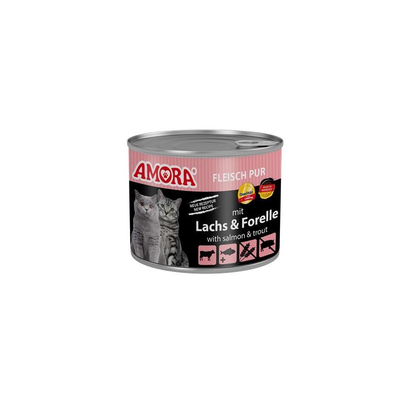 AMORA Fleisch pur ist eine hochwertige Vollnahrung, die ausschließlich aus Fleischstücken und Innereien hergestellt wird.AMORA Fleisch pur enthält besonders viel tierisches Eiweiß, Vitamine und Mineralstoffe. AMORA Fleisch pur enthält keine Aroma-, Farb- und Konservierungsstoffe.Hergestellt in Deutschland.Alleinfuttermittel für ausgewachsene Katzen.Zusammensetzung:50 % Rind (Lunge, Fleisch, Leber, Herz, Niere), 2 % Rinderbrühe, 10 % Lachs (Fisch und Fischnebenerzeugnisse), 10 % Forelle (Fisch und Fischneben- erzeugnisse), Mineralsto e, Distelöl. Kann Spuren anderer Zutaten enthalten.Inhaltsstoffe:Rohprotein 10 %, Fettgehalt 6,5 %, Rohasche 2,5 %, Rohfaser 0,2 %, Feuchtigkeit 77%.Zusatzstoffe:Vitamin E 25 mg, Taurin 500 mg, Zink als Zinkoxid 20 mg, Jod als Kalziumjodat - wasserfrei 0, 5 mg. Technologische Zusatzstoffe: Cassia Gum 2500 mg.Fütterungsempfehlung: Eine durchschnittliche große Katze (4 kg) benötigt etwa eine Dose AMORA FLEISCH PUR (400 g) am Tag.Inverkehrbringer: BTG Beteiligungs GmbH, Gewerbestr. 5 - 7, 42499 Hückeswagen, Tel.: 02192/9357642, E-Mail: info@btg-systemlogistik.de
